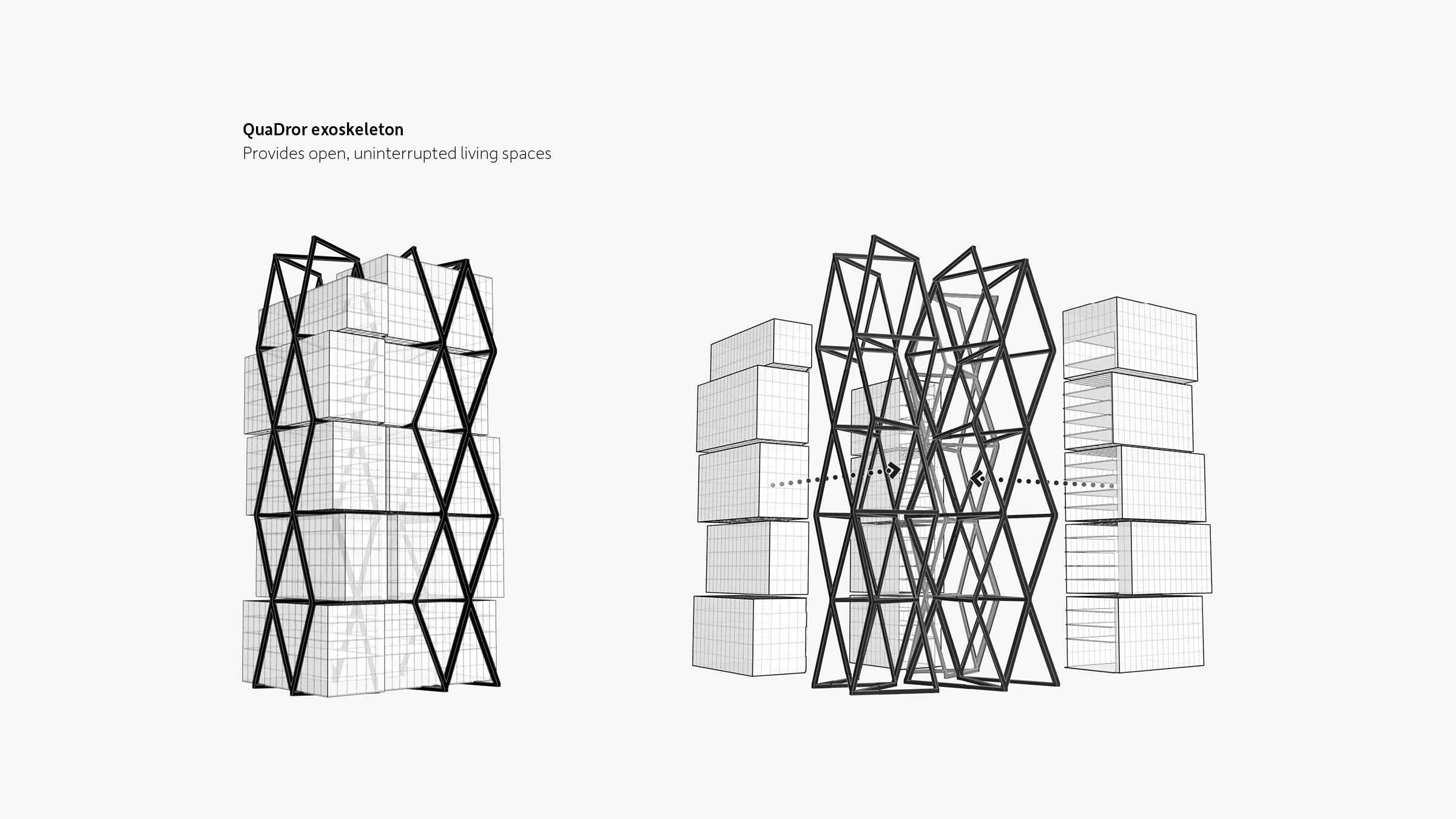 A QuaDror exoskeleton replaces the interior support system of a traditional high-rise, allowing glass volumes to be inserted into individual apertures formed by the frame. The structure’s twenty-five floors are effectively divided into independent five-story units, disseminating its weight in smaller, lighter increments throughout the QuaDror system. By placing the supporting framework on the outside, the building provides unusually open, uninterrupted living spaces for its tenants.
