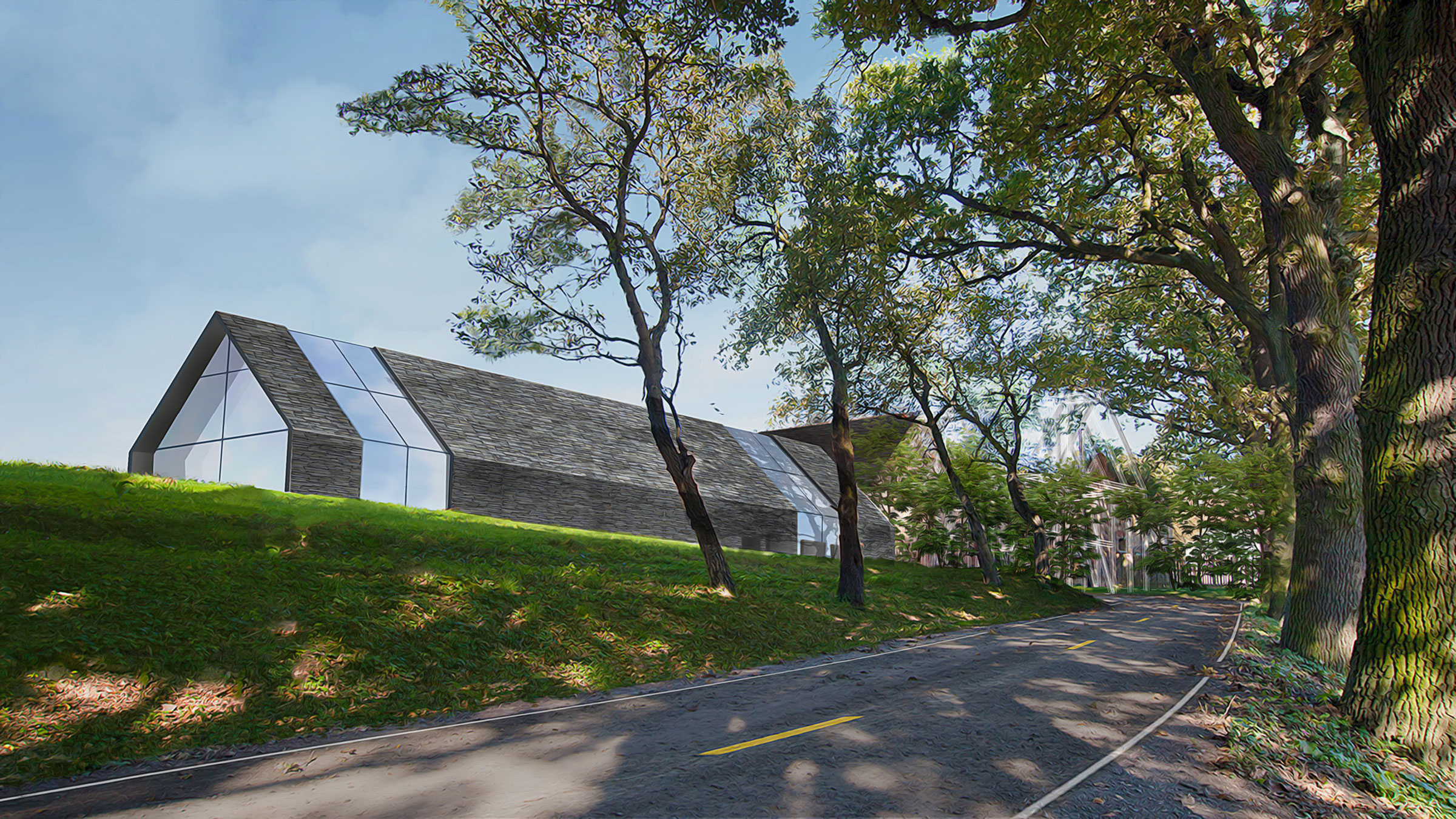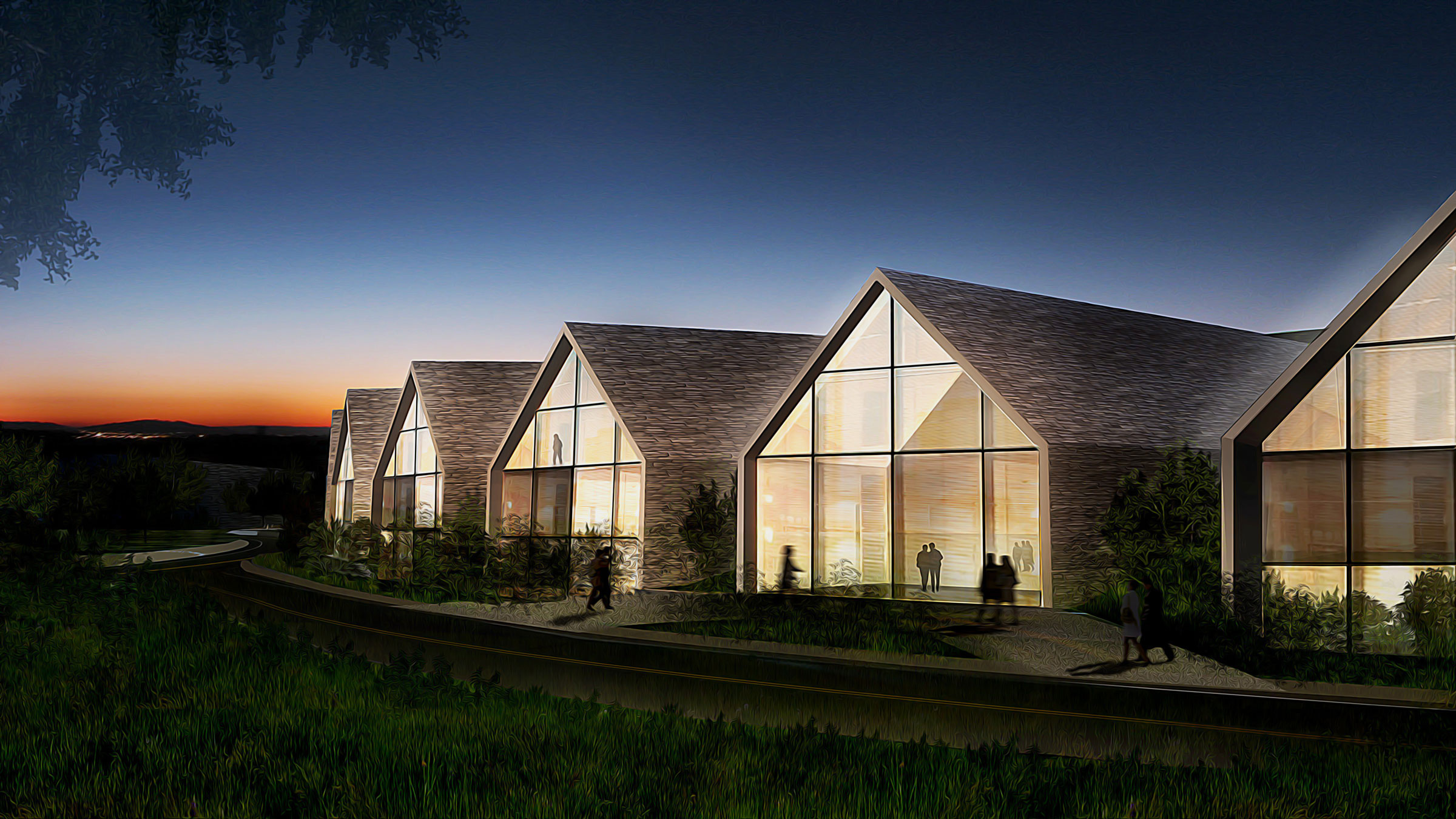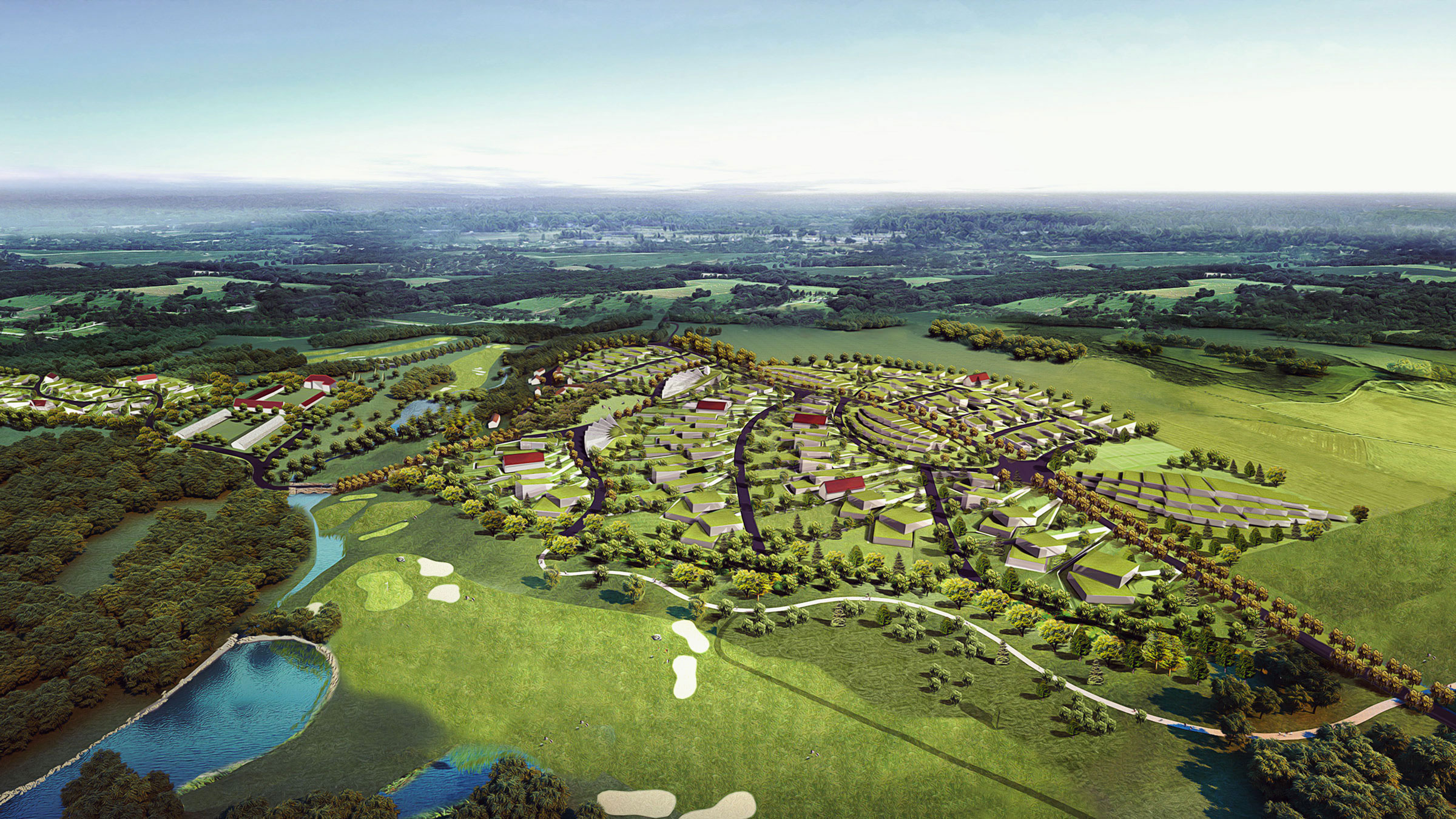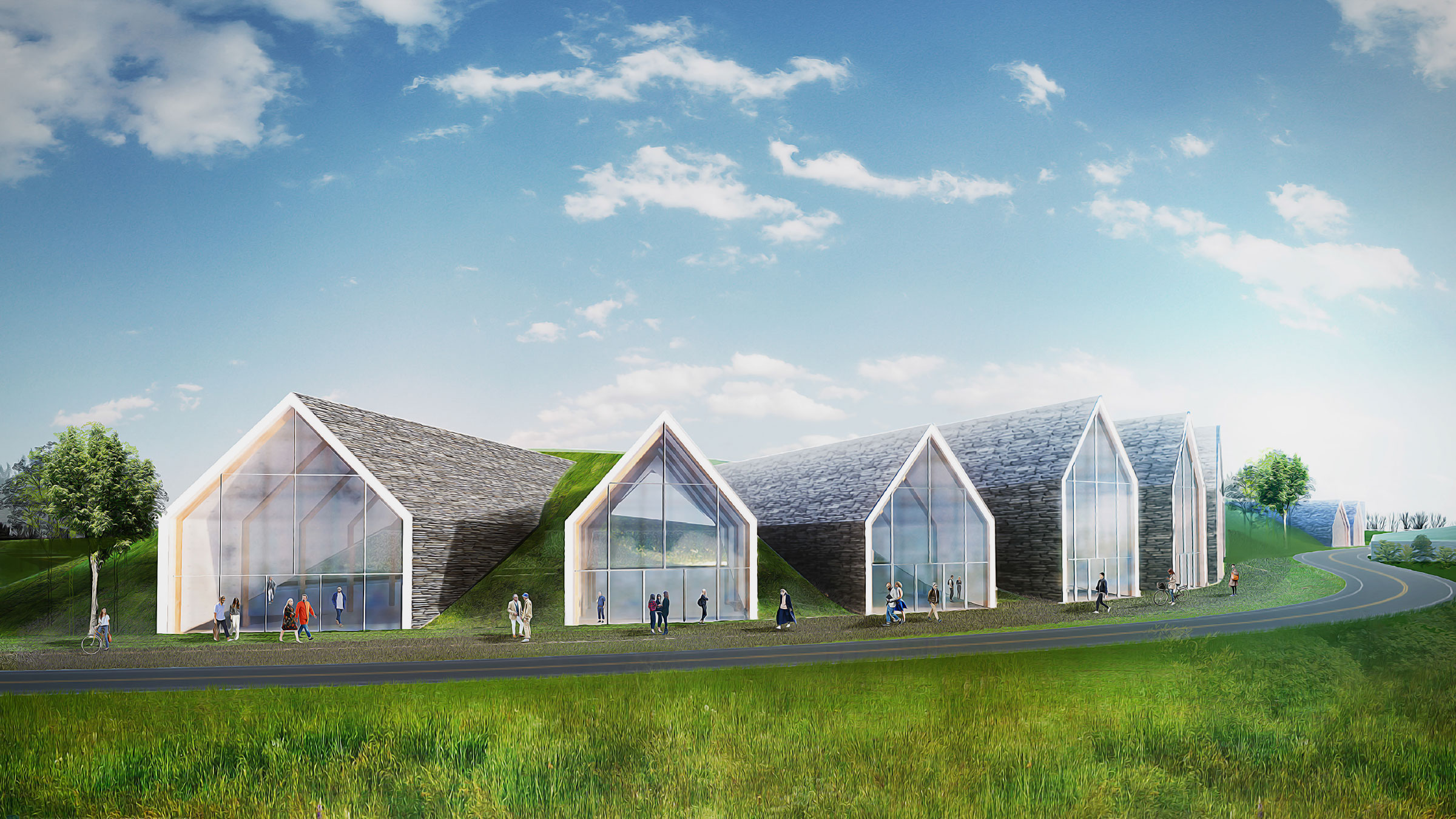 Terraces, landscaping, and ample green space around each residence further produce harmony between structure and landscape. We created restaurants, a wellness center, school, hotel, and other structures based on this logic, plus seven typologies for houses, one of which is the Eco House. As the only residence with a pitched roof, and therefore the only visible residence, the Eco House serves as a quiet sign of life amidst Hunters Hills’ camouflaged built environment. Pitched roofs also cover commercial buildings, defining them as spaces for community and commerce rather than private dwellings.