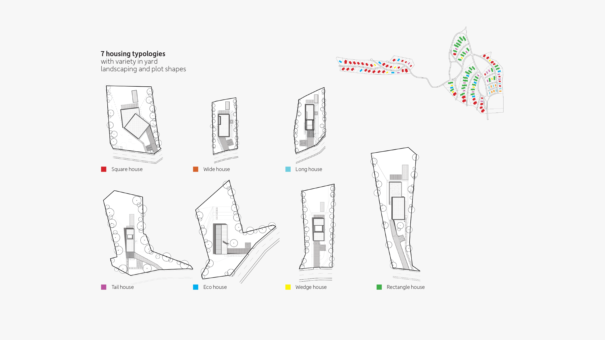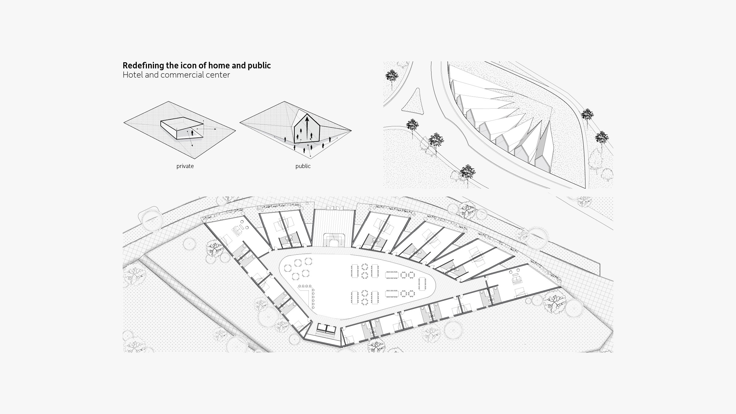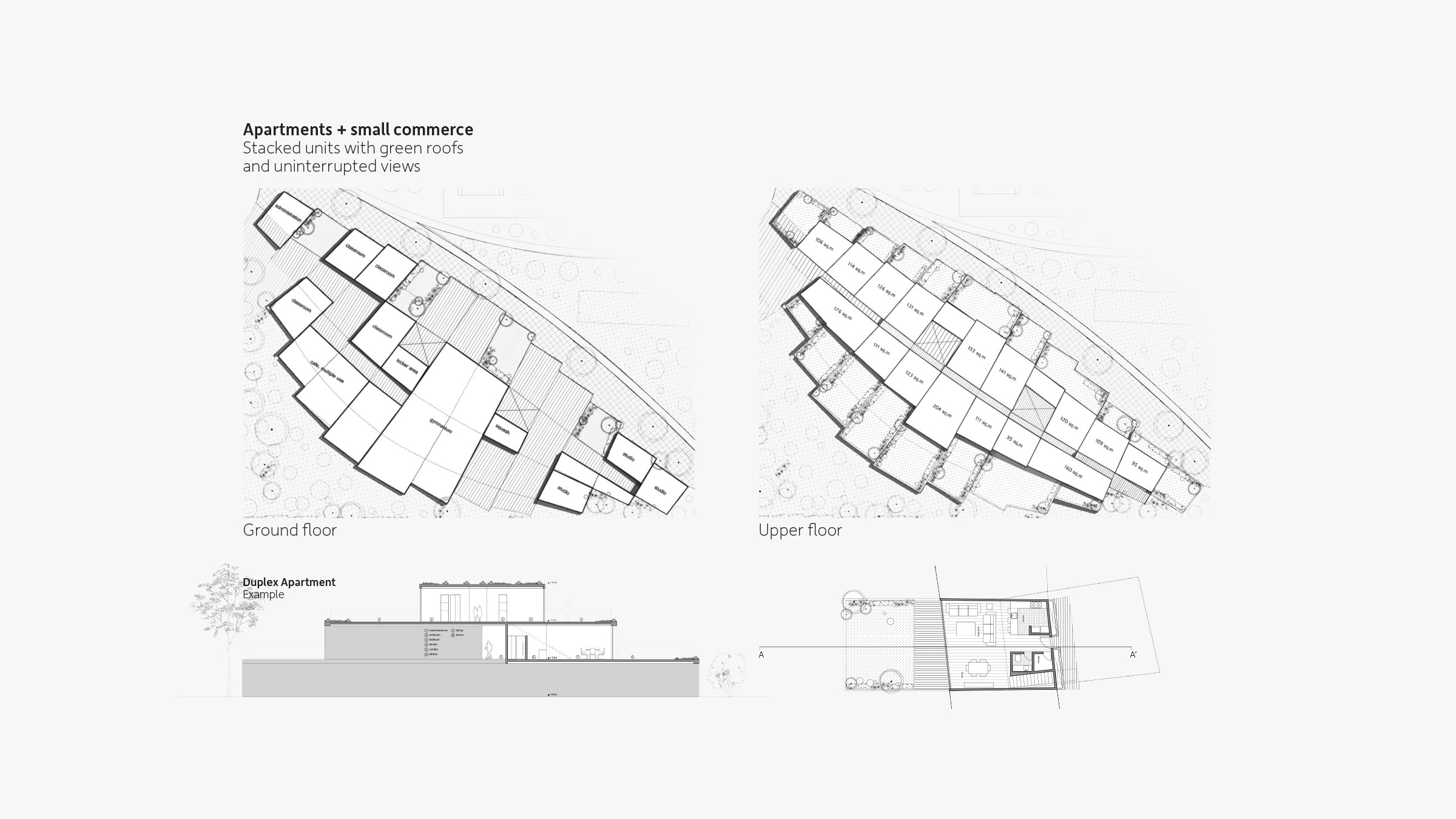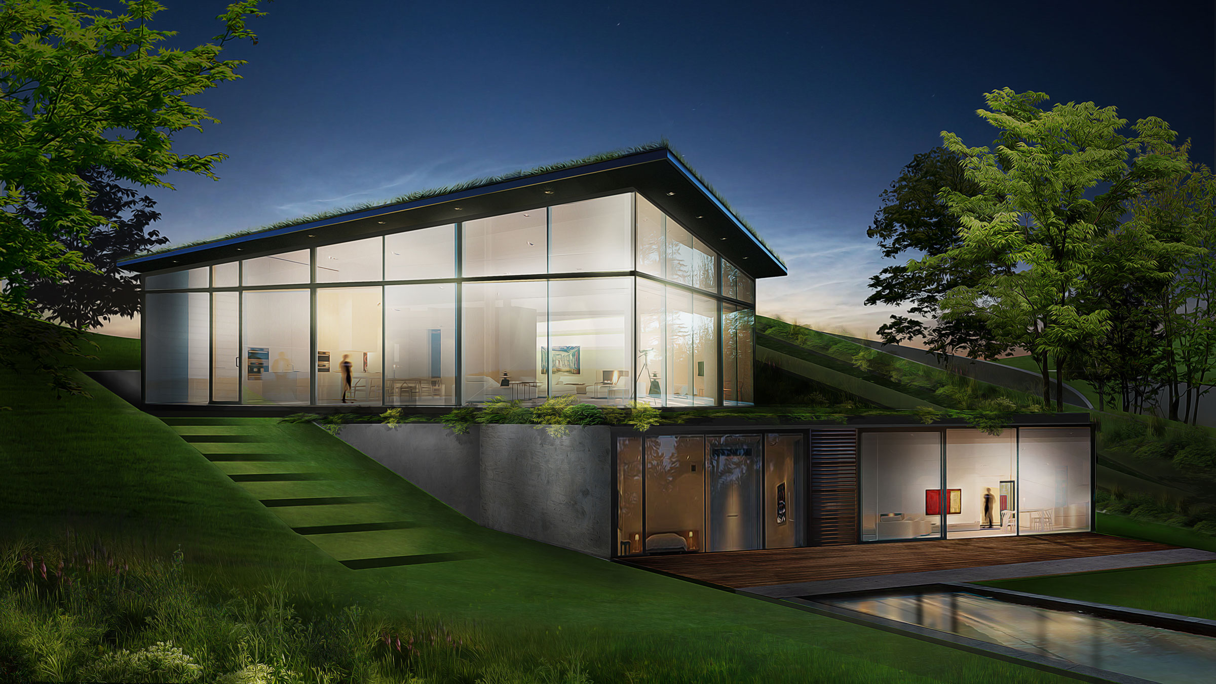 Terraces, landscaping, and ample green space around each residence further produce harmony between structure and landscape. We created restaurants, a wellness center, school, hotel, and other structures based on this logic, plus seven typologies for houses, one of which is the Eco House. As the only residence with a pitched roof, and therefore the only visible residence, the Eco House serves as a quiet sign of life amidst Hunters Hills’ camouflaged built environment. Pitched roofs also cover commercial buildings, defining them as spaces for community and commerce rather than private dwellings.