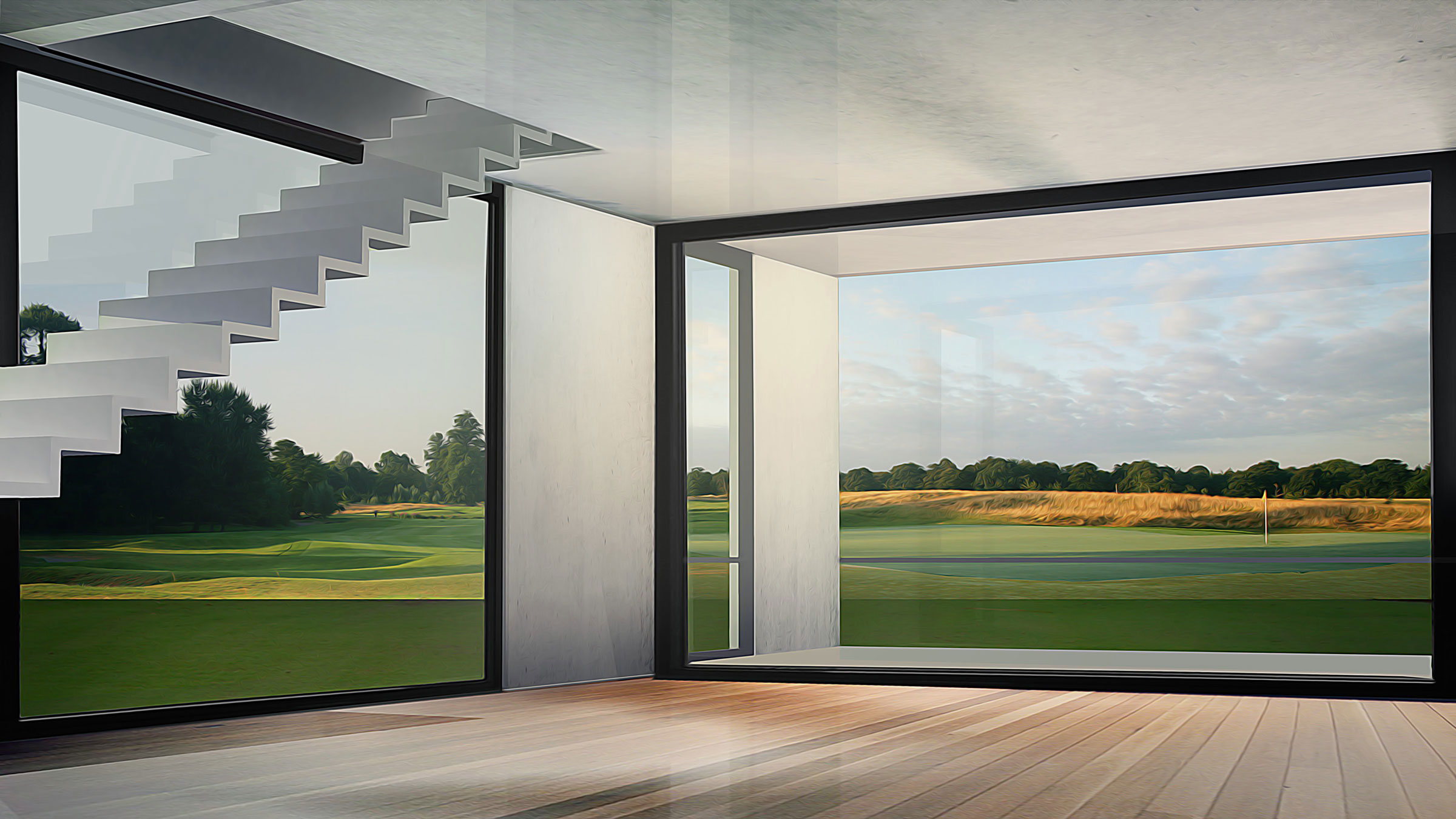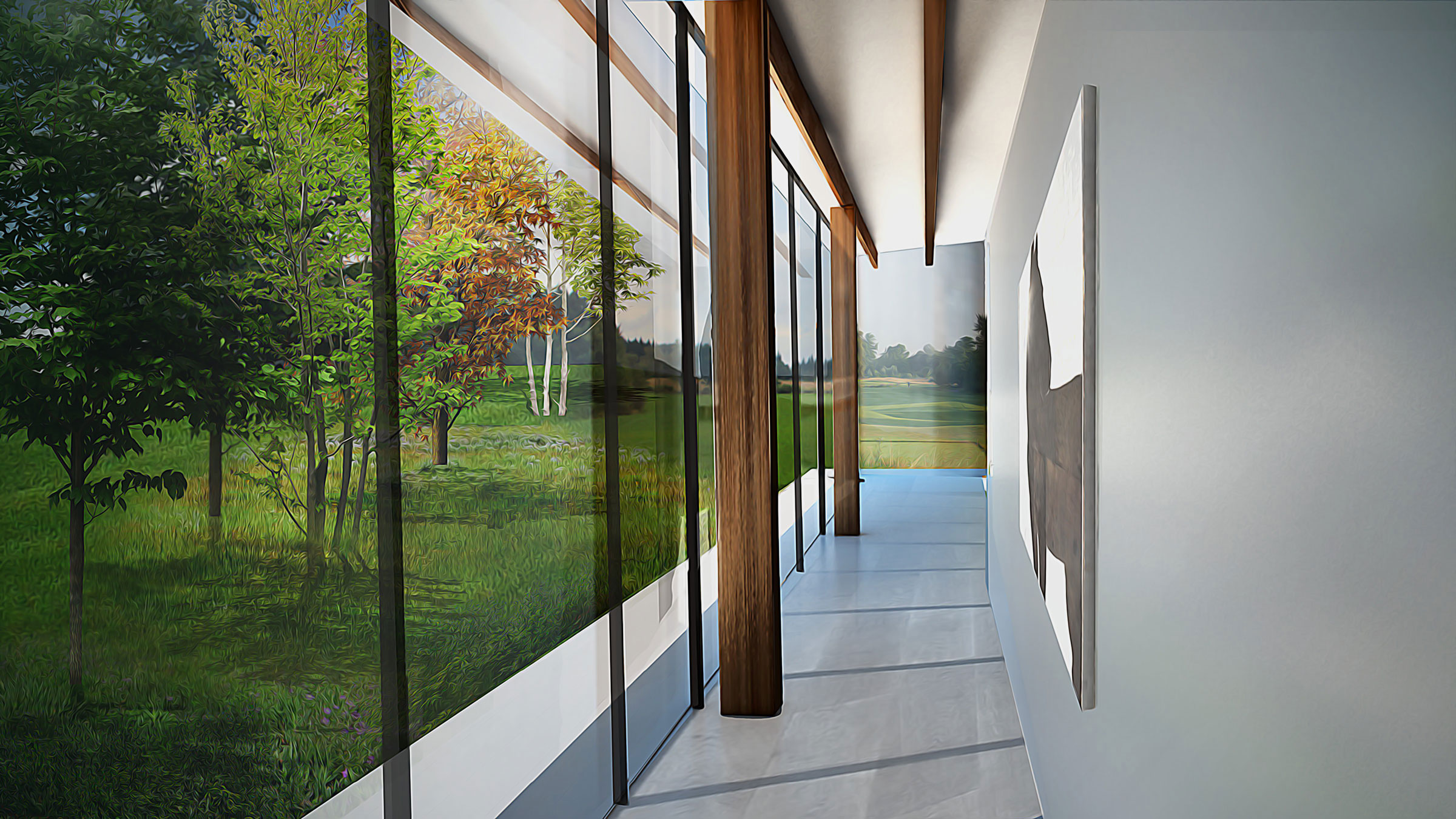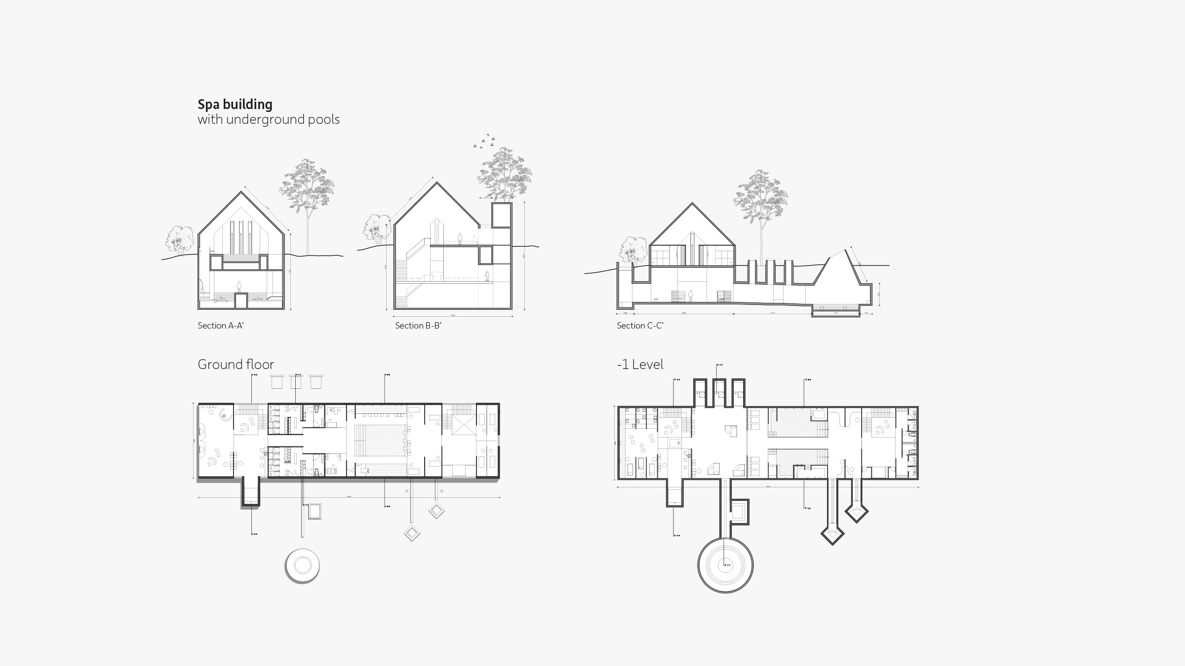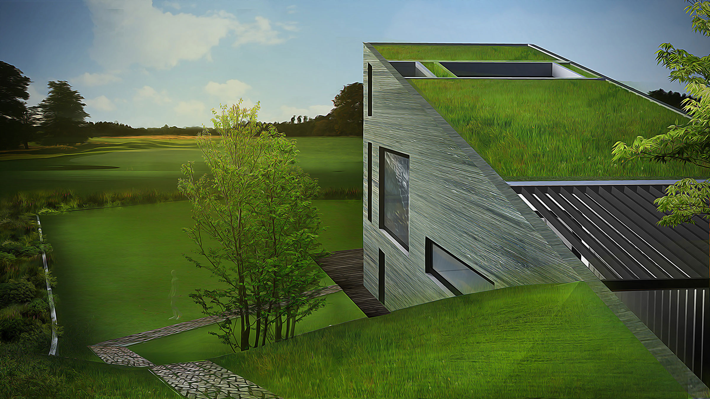 Terraces, landscaping, and ample green space around each residence further produce harmony between structure and landscape. We created restaurants, a wellness center, school, hotel, and other structures based on this logic, plus seven typologies for houses, one of which is the Eco House. As the only residence with a pitched roof, and therefore the only visible residence, the Eco House serves as a quiet sign of life amidst Hunters Hills’ camouflaged built environment. Pitched roofs also cover commercial buildings, defining them as spaces for community and commerce rather than private dwellings.