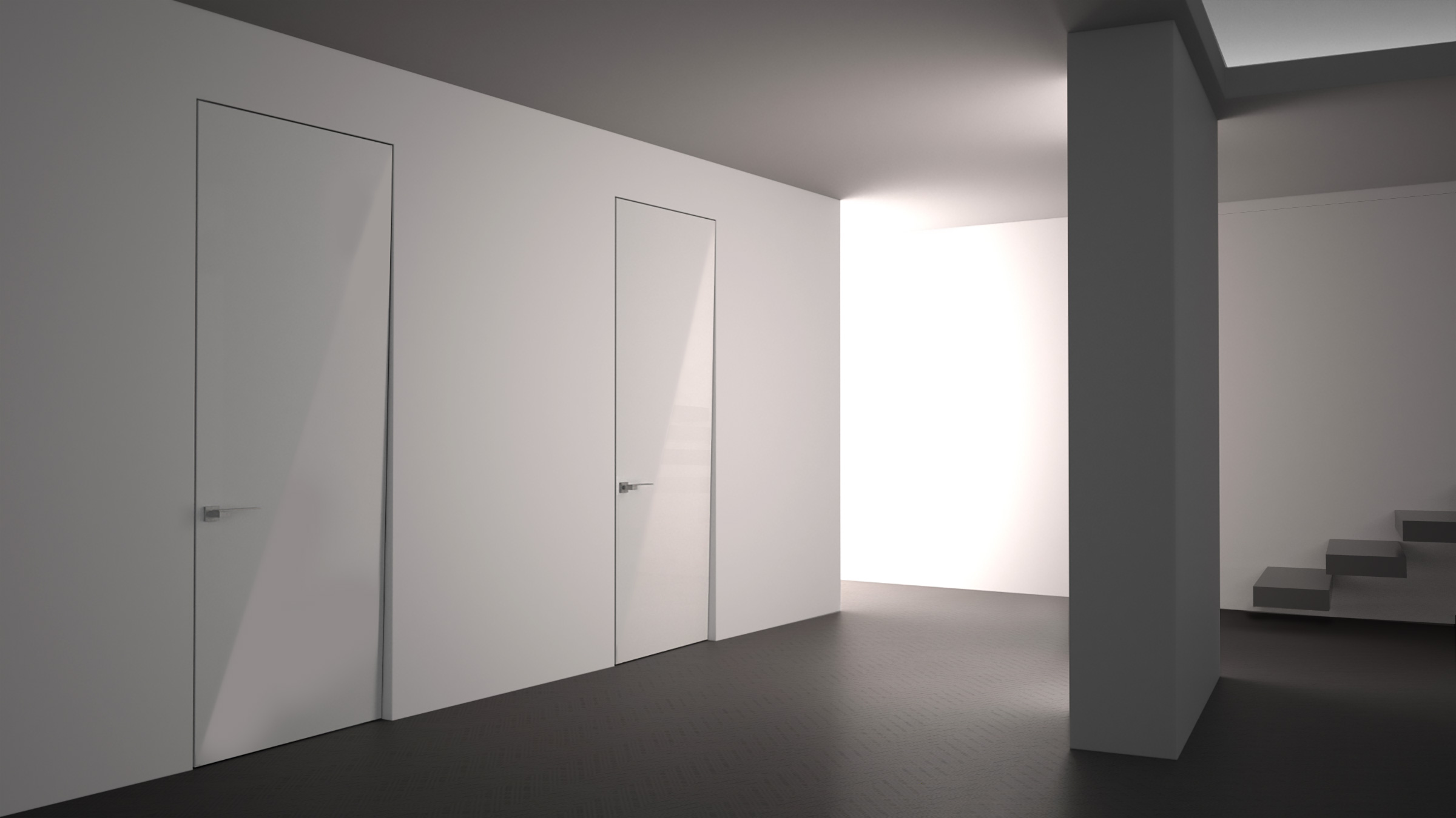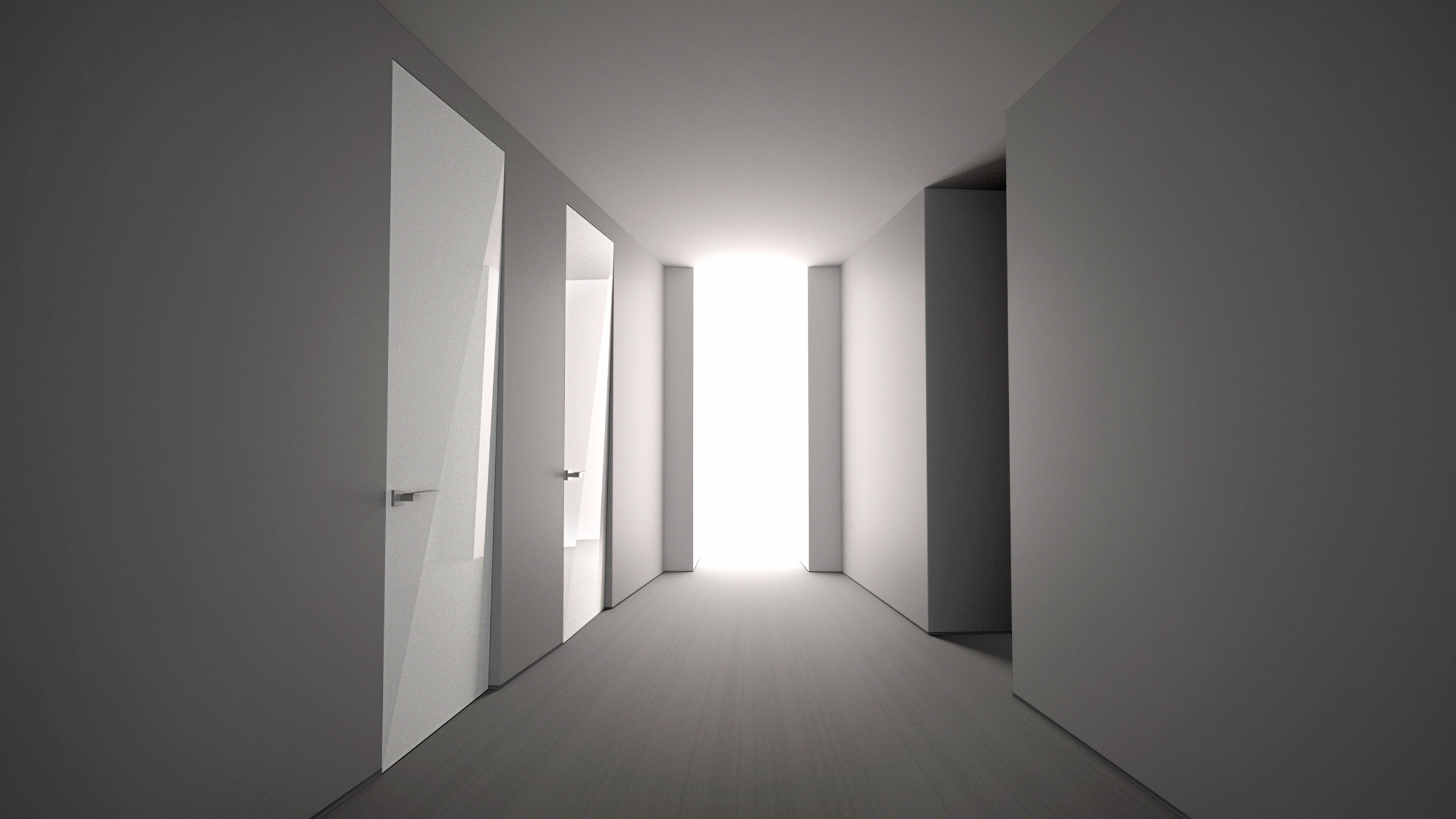 A simple diagonal fold gives the door a playful two-toned depth that subtly reveals the inside door frame, creating the illusion that the door is slightly ajar. As the light changes and one moves past the door, the shifting shadows animate the space.