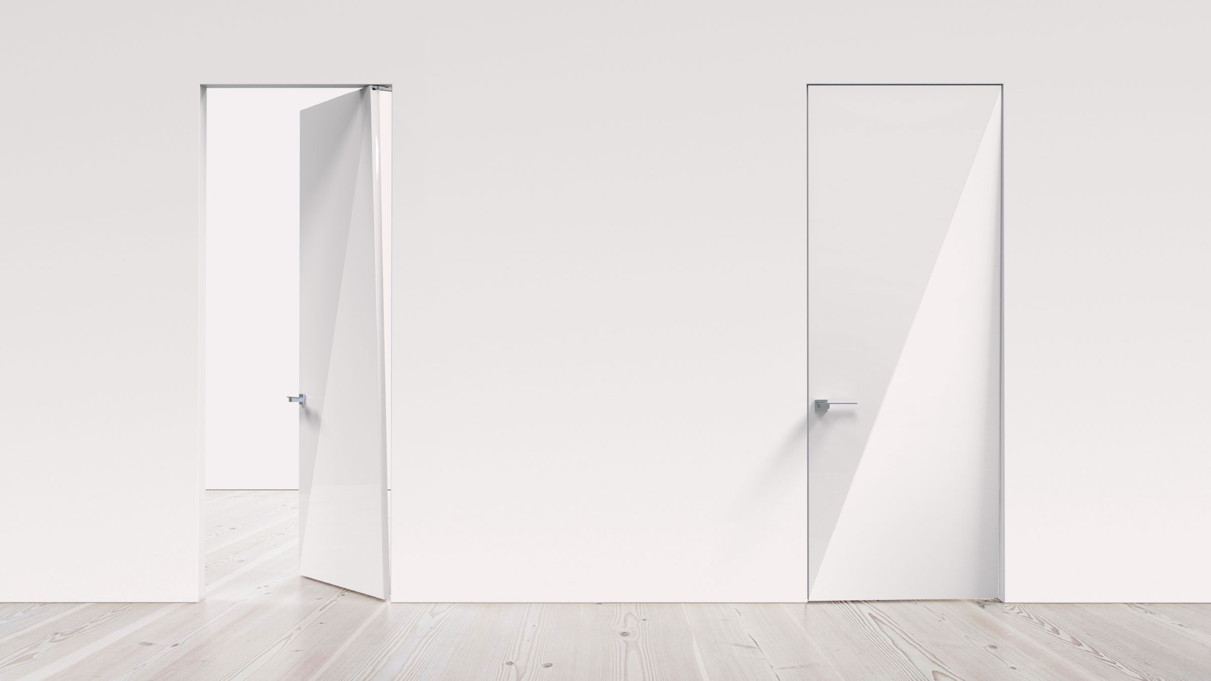 The single diagonal crease of the door is created by extending one of its four corners back to the opposite side of the door’s frame. This forms, in the most minimal way, a fracture of light that reflects on its lustrous high-gloss surface, and also alludes to the door’s inward swinging movement. The Davina door is available in red, black, or white.