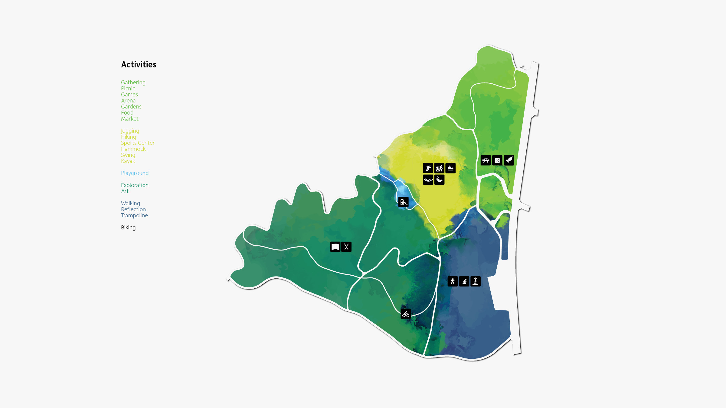 Five main zones, each with their own distinct qualities, are designed to provoke emotion. The Plaza, at the entrance of the park, presents nature as a place for collective experience and gathering. Interaction and play are encouraged through a series of interventions spread throughout: swings and hammocks sway above the bed of the forest (The Loop); giant ball pits, inspired by Turkish spice markets, invite people to dive in (The Pool); a footpath floats above the ground and twists around tree trunks into giant loops with trampolines at the center (The Chords). The Grove, a maze-like trail pollinated with sculptures that relate to the landscape, spurs exploration, while The Fountain of Clarity, a cube-shaped frame that sends water down all four sides and opens via hydraulic piston to envelop oncomers, prompts reflection.