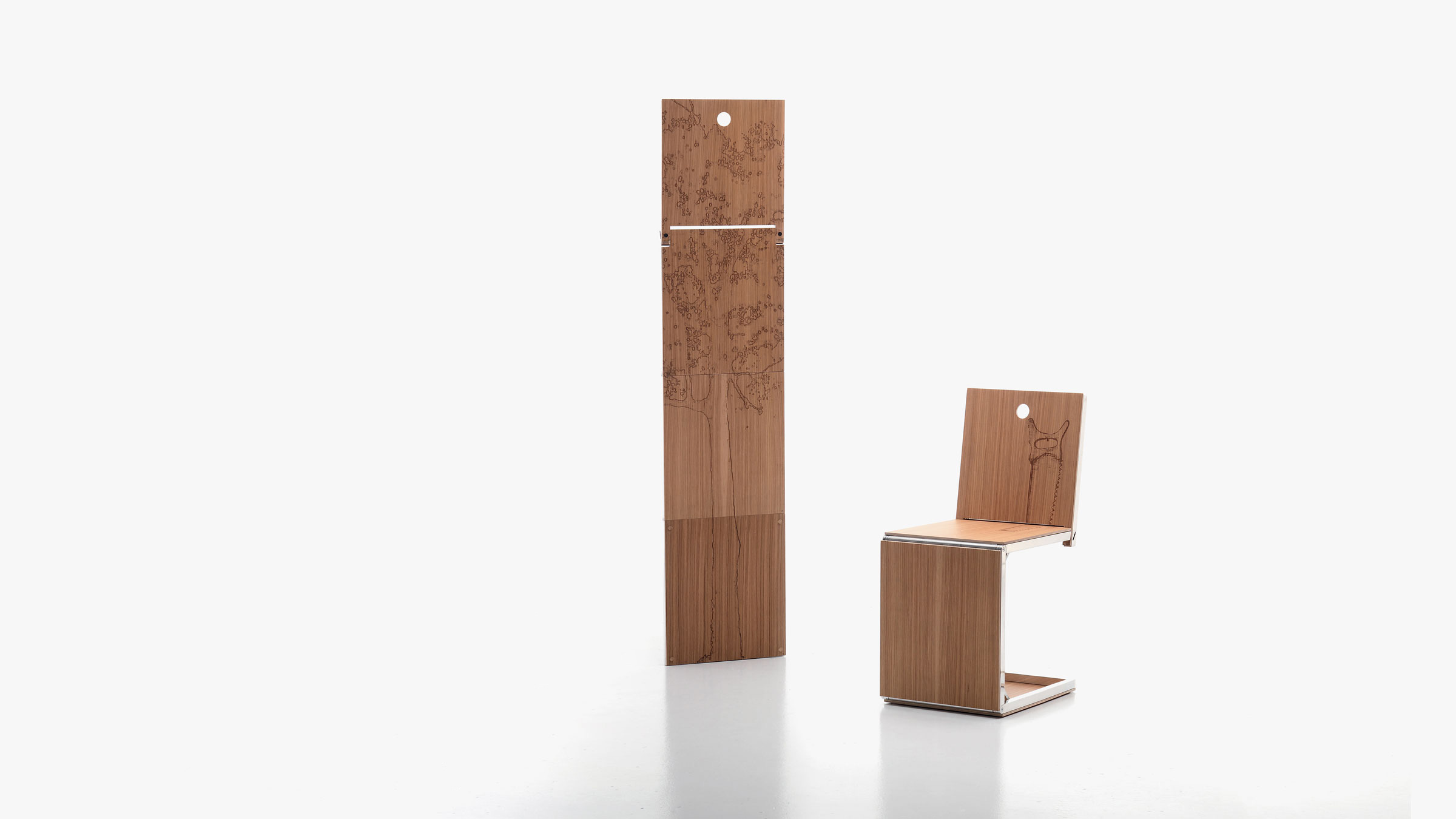 The Pick Chair is a canvas with movable joints, where its flat surfaces double as a place for art. Its hinged metal framework comprises four panels, the top of which features a small hole. The chair can therefore be hung on a wall when not in use, and morphs into a seat with a single gesture: simply set it on the ground and its hinges pivot to form a sturdy base, seat, and back. What’s striking about the Pick Chair is its smooth transition from the 3D (an object) to 2D (an artwork). It stands at the intersection of these dimensions, and paved the way for the recurring theme of physical transformation in our studio’s work today.