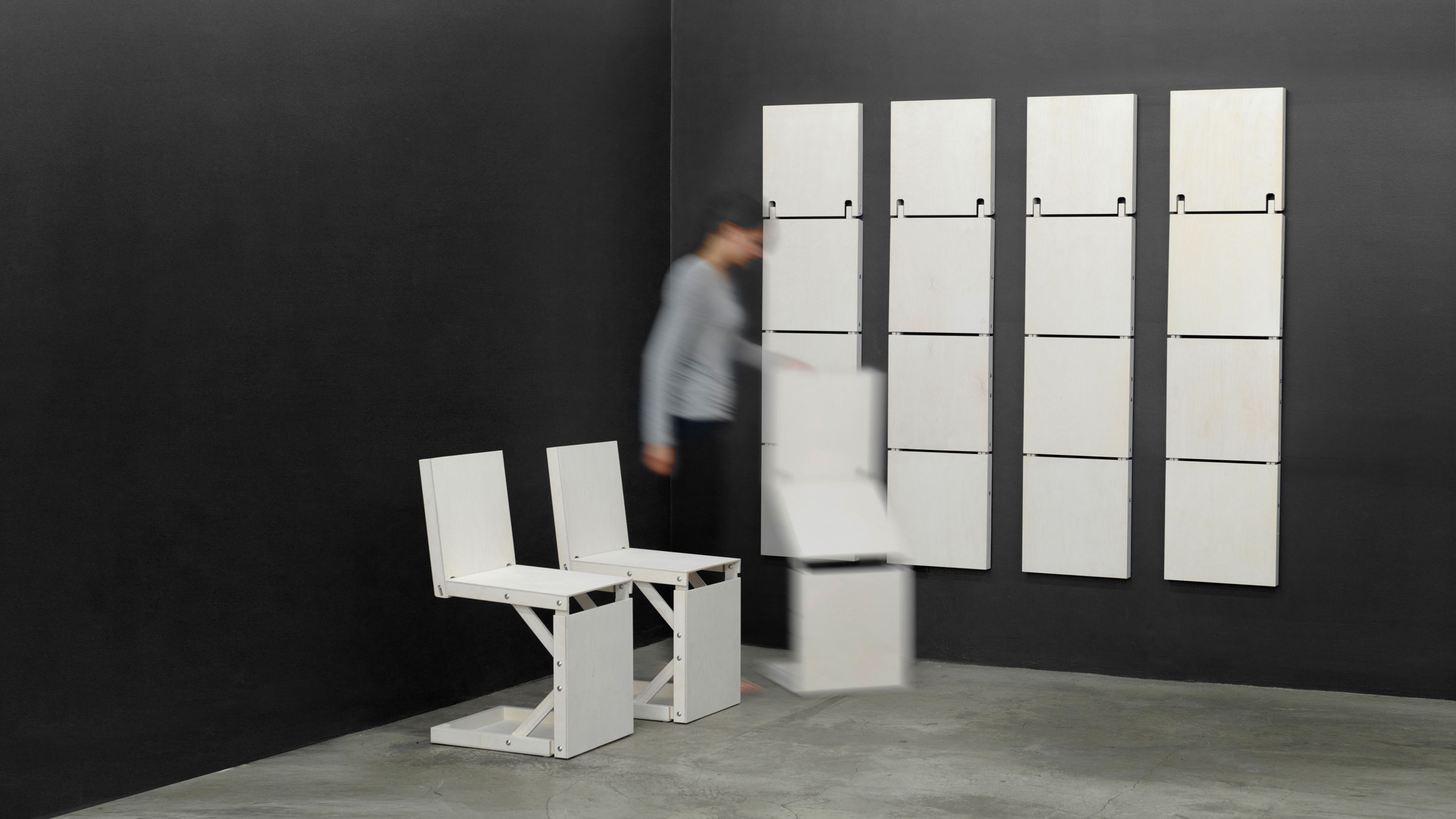 I began my graduation project at the Design Academy Eindhoven by examining the characteristics of a common folding chair. Typically the spartan, unsightly seat is hidden away somewhere, only to be pulled out when company arrives. Why do we invite guests to sit on a piece of furniture we’re not proud of? What’s more, if we don’t have room to accommodate extra seating, we probably don’t have much storage space, either.
