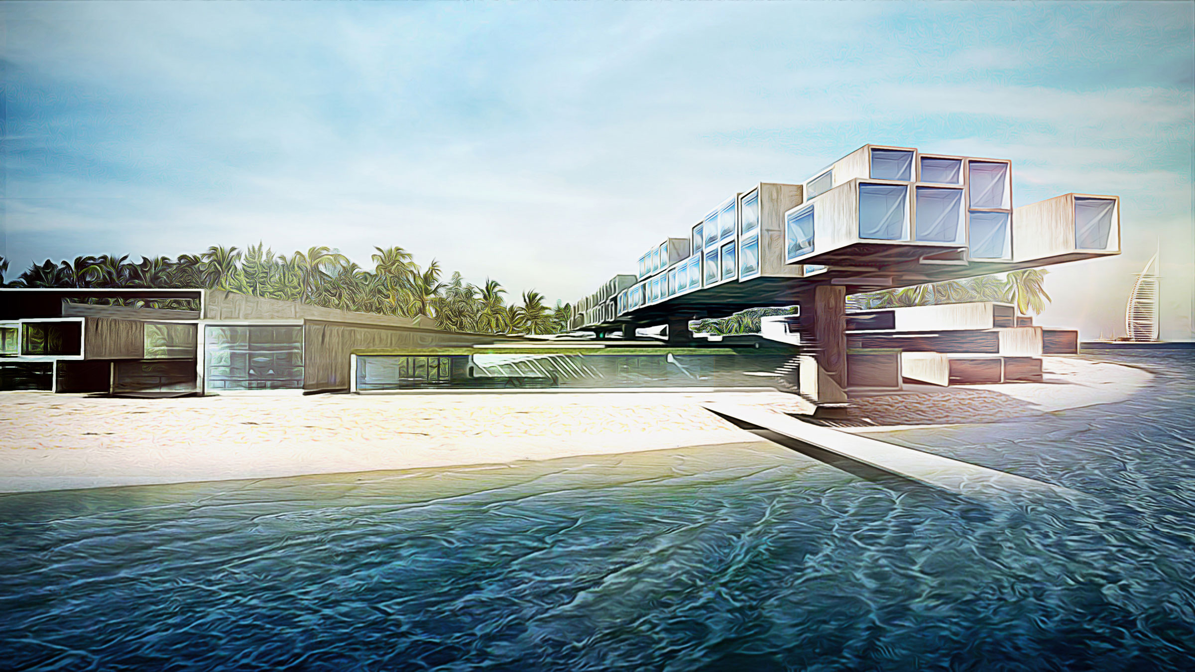 With the belief that privacy is integral to the definition of luxury, Porto Dubai is designed to maximize lot size, location, and views for each resident. Resembling the division of a timepiece dial, the island is segmented to allow every resident to have infinite views of the ocean and surrounding greenery. This logic was applied throughout the design schemes of the residential homes and boutique hotel. Residents share a main road into Porto Dubai from which they directly enter their private property.