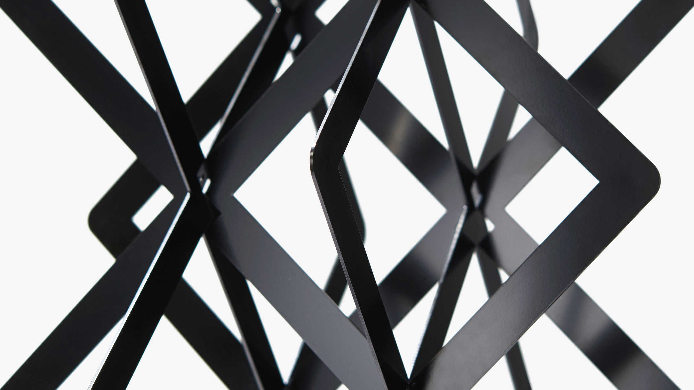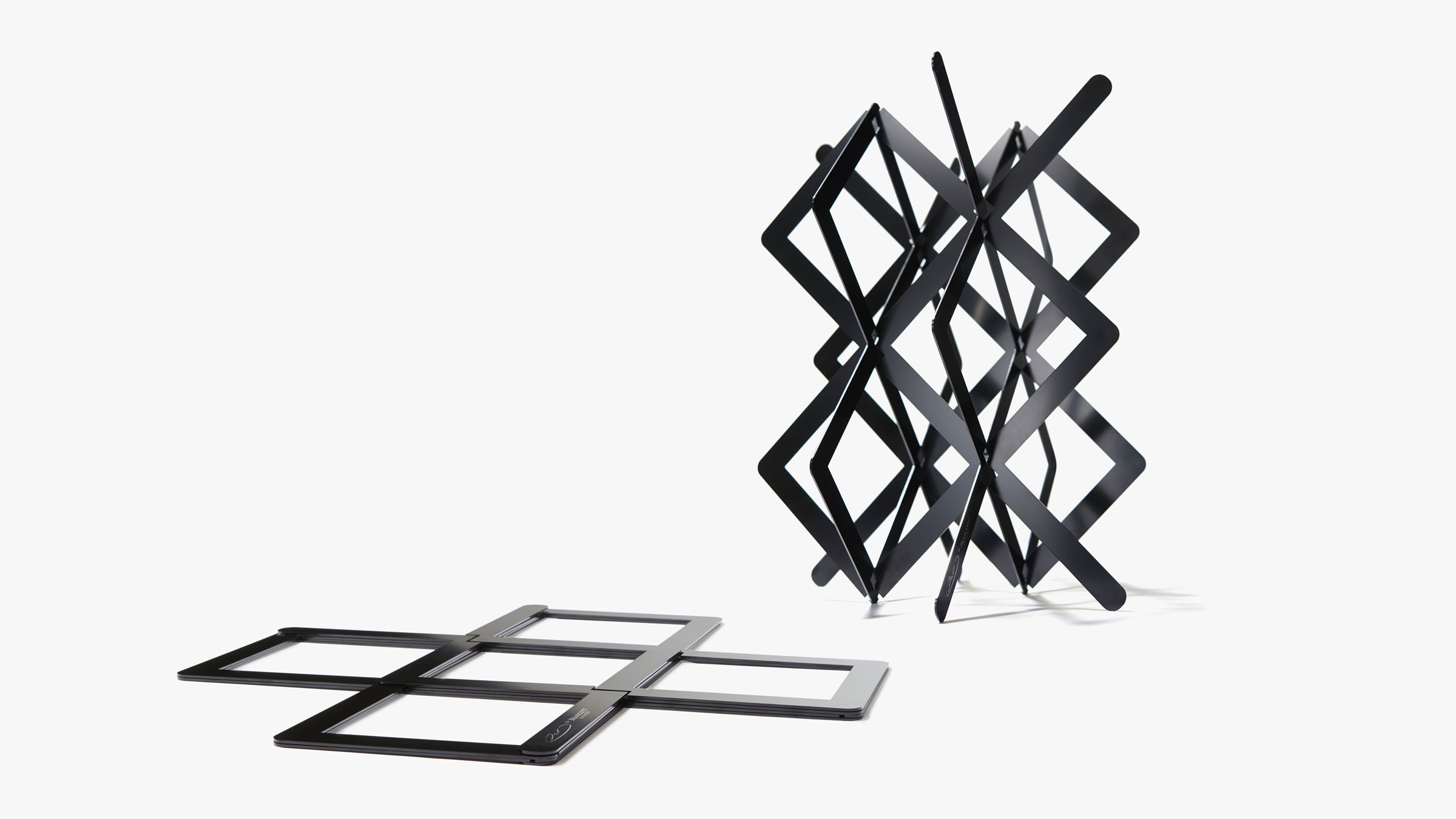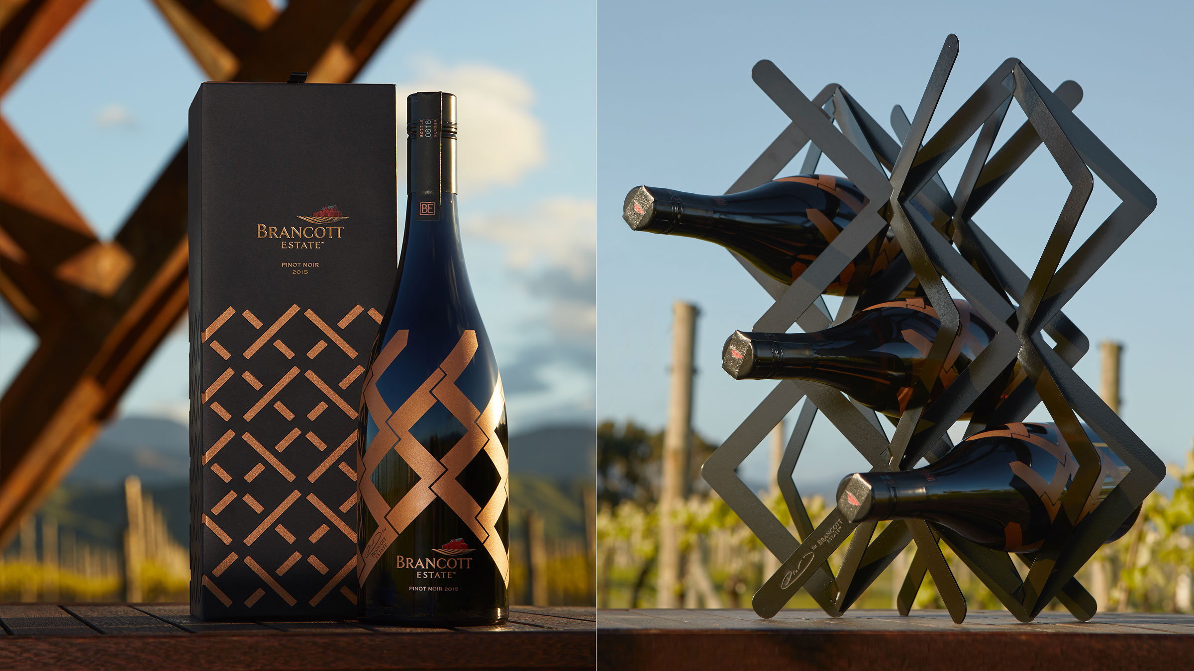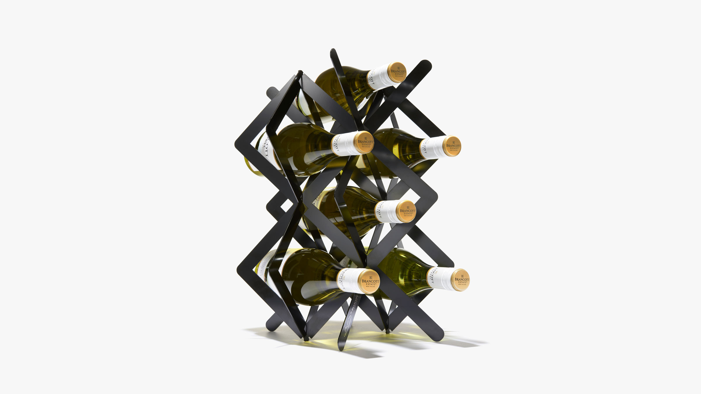 To further echo the experience of visiting the vineyards—where a bottle of wine acts as a special end result that visitors take home—we wanted to give a piece of the sculpture to visitors in the same way. We translated the installation’s geometry into a functional, smaller-scale object made of electro-coated steel, produced by New York manufacturer Bengal Fierro. Its title, Present, is a nod to the in-the-moment ritual of opening a bottle of wine. Its triangulations are the perfect size to accommodate up to six bottles of wine. Together, both elements serve as a thoughtful interpretation of Brancott Estate’s distinctive style of winemaking that simultaneously demonstrates the studio’s holistic approach to design.