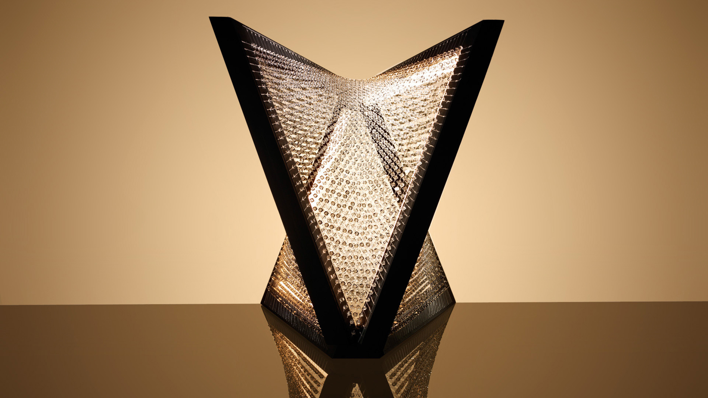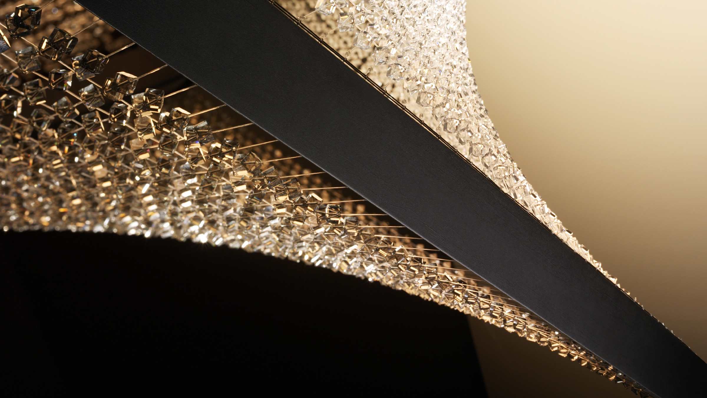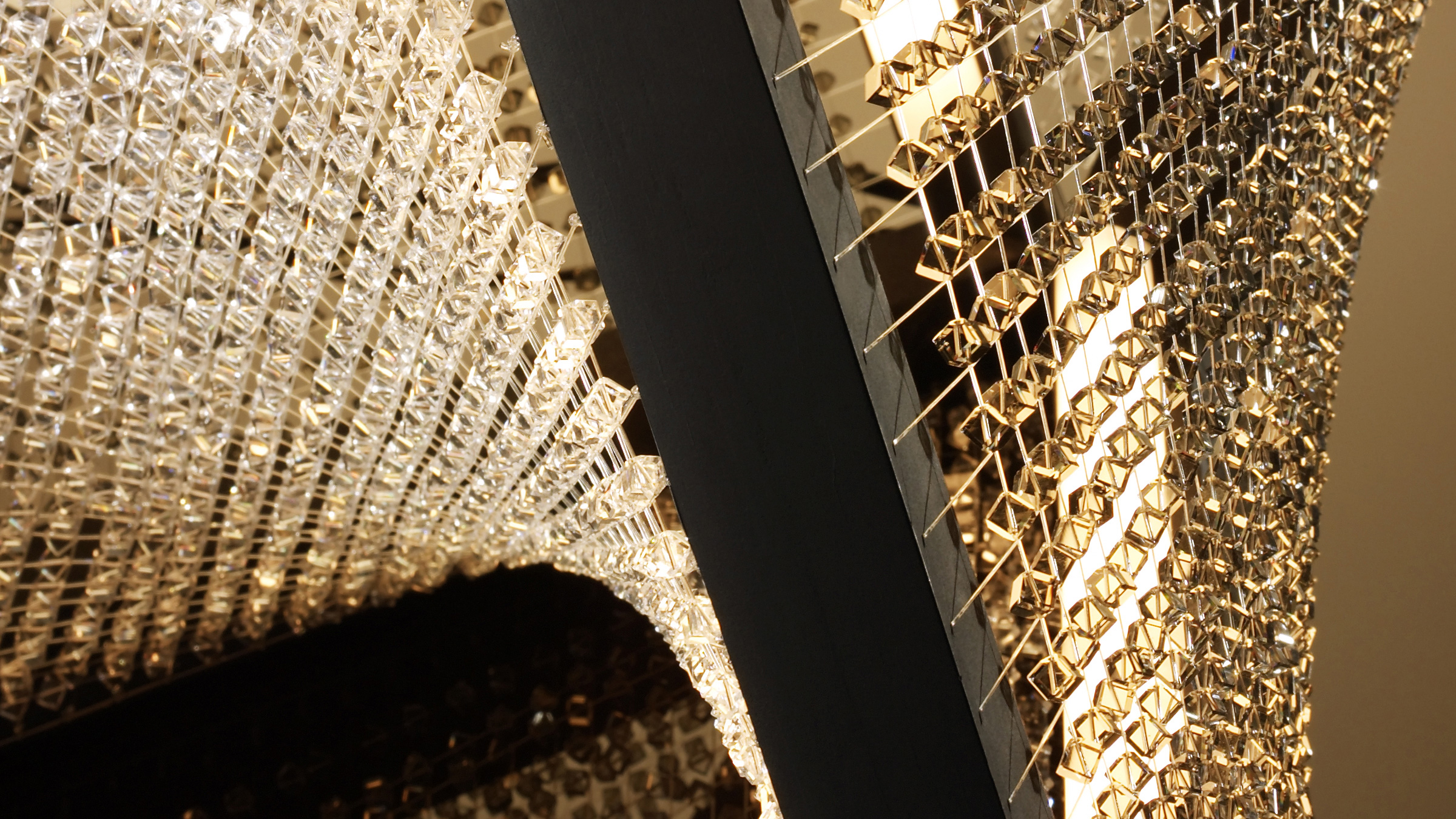 This unusual piece displaces the chandelier from the ceiling to the floor. Clear strands weave together 6,400 Swarovski crystals in a grid pattern. When the frame opens, the grid transforms into two sweeping parabolas. The frame itself is a Dror patent and a predecessor of QuaDror: a self-locking hinge system with no fasteners. Four incandescent strips are placed on the inner walls of the frame, creating a dramatic ambiance as the light glimmers through the curved web of crystals.