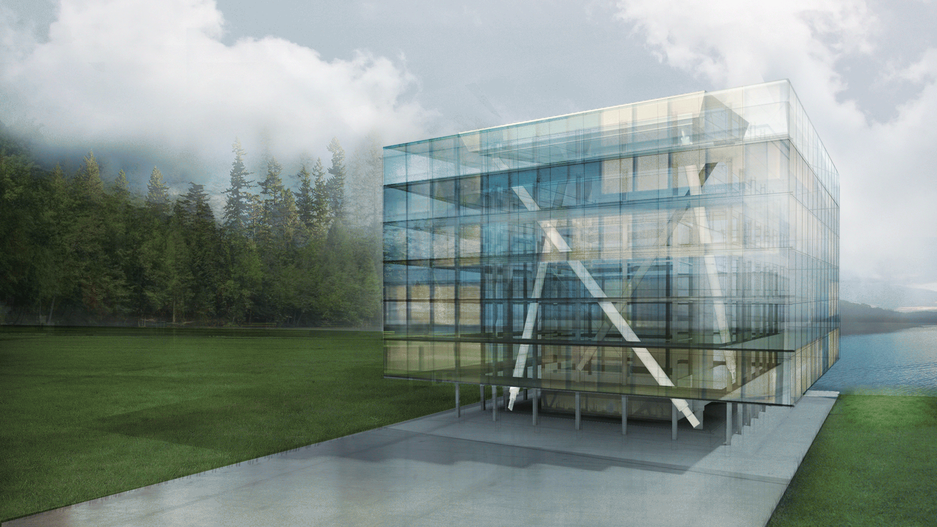 The Twist Library separates structure into tension and compression. Unlocked, it springs into a lighter, taller, and airier structure. With all essential library functions packaged into a central core, the exterior nesting spaces are flexible to transformations in program, layout and expectation.