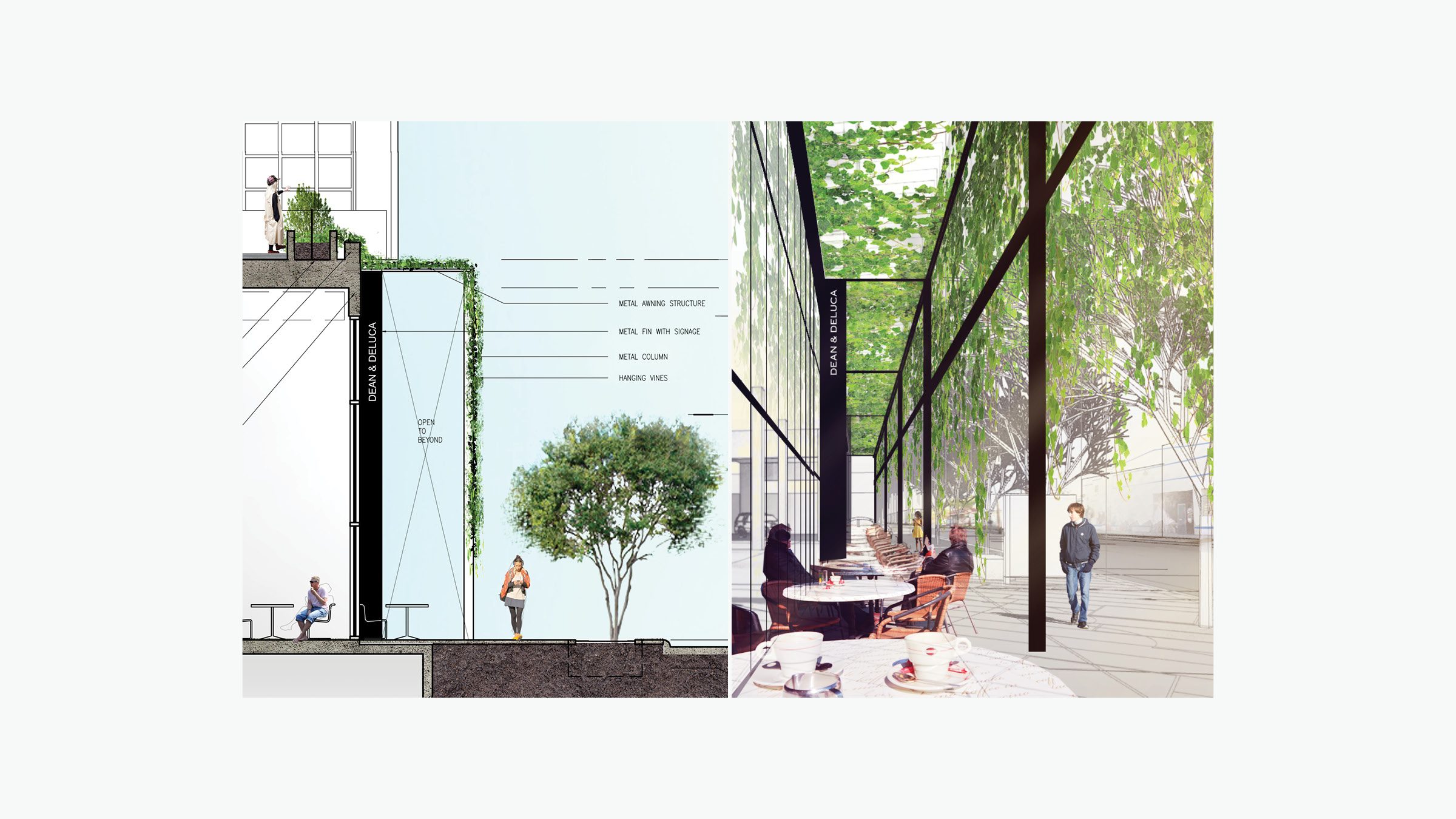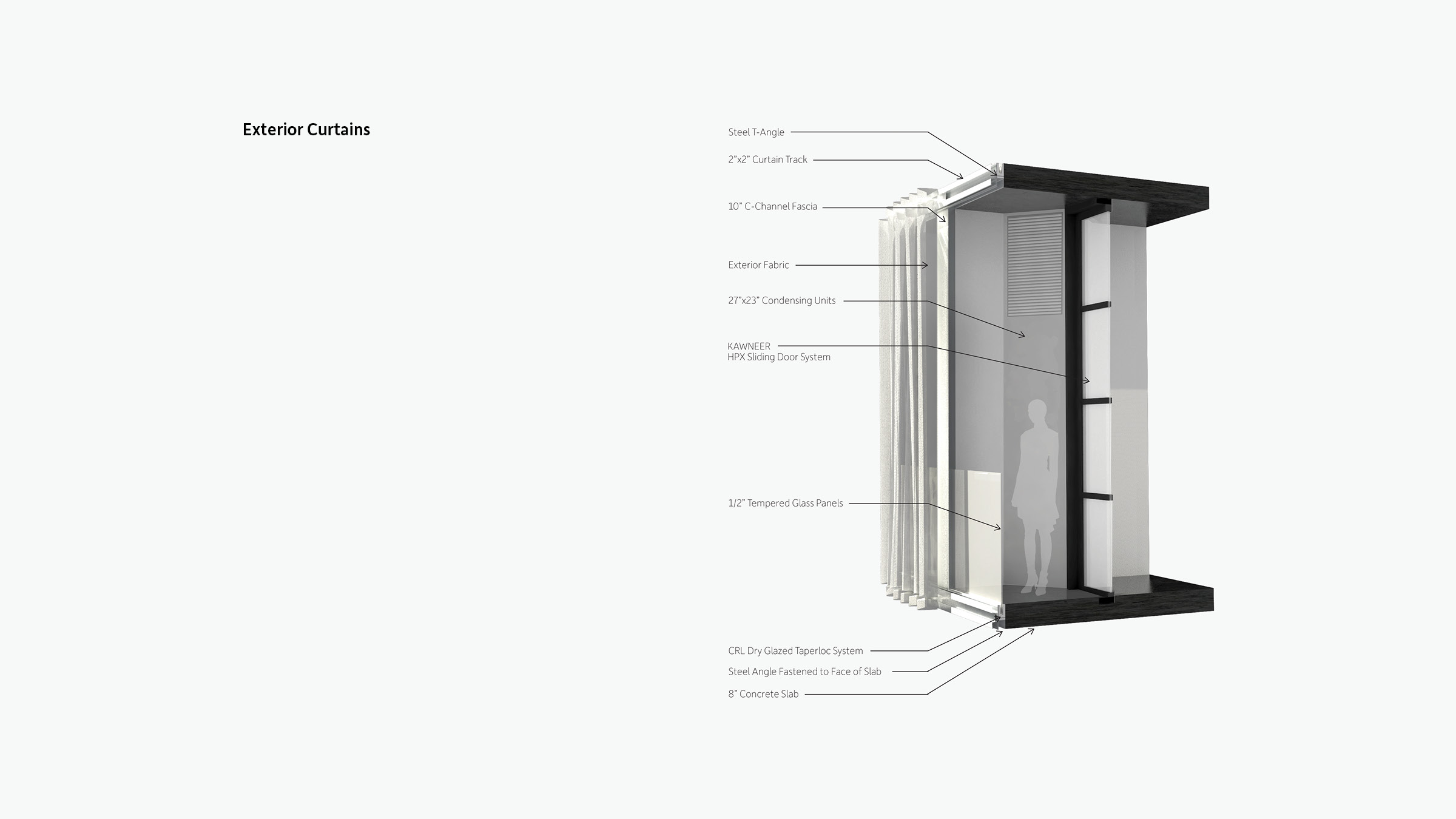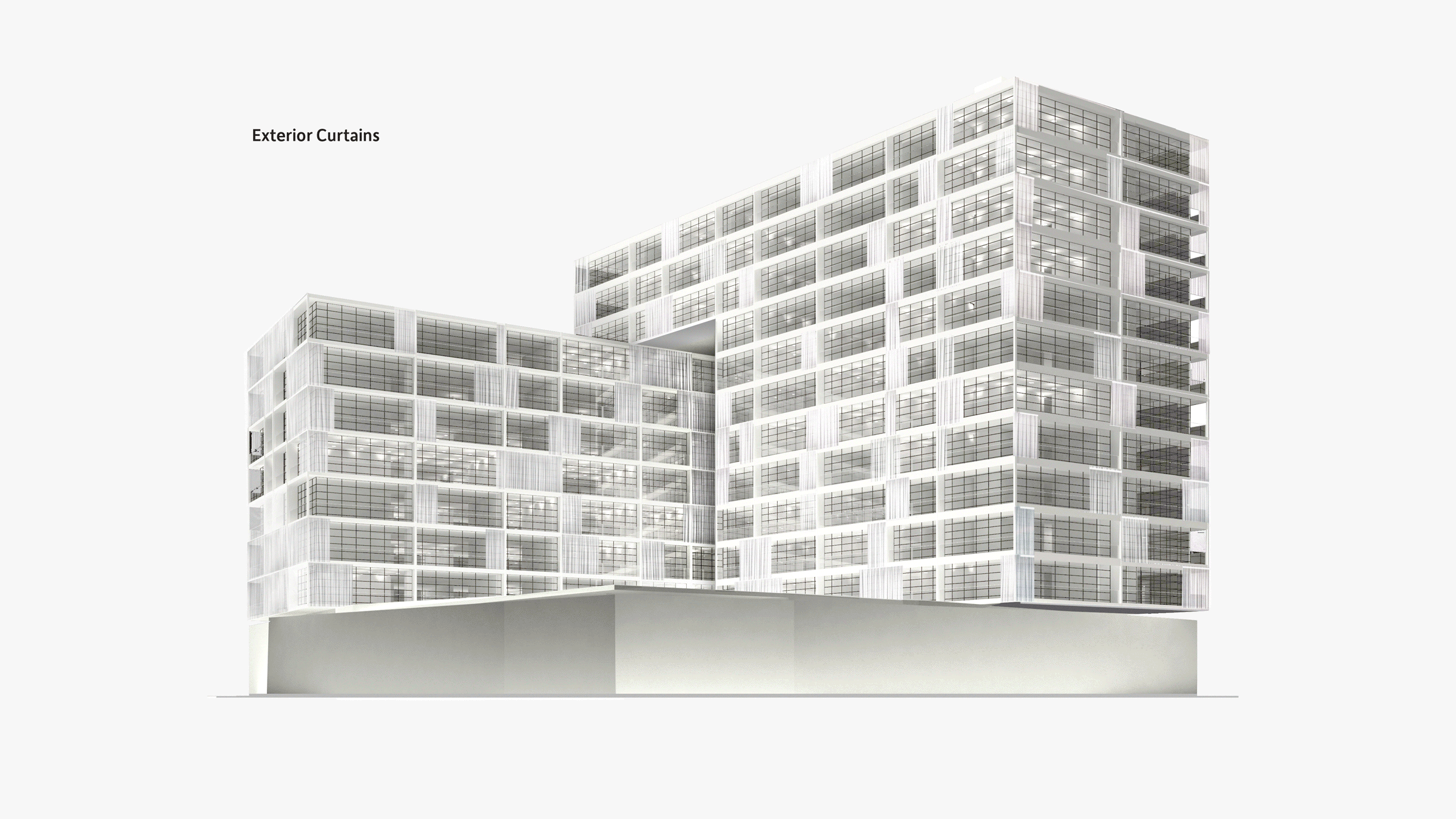 Outside, at ground level, a vegetation-draped trellis extends from the building to provide canopy and shade, while the floors above are cloaked in reflective “curtains”: an ever-changing exterior installation that becomes a living reflection of its dynamic residents.