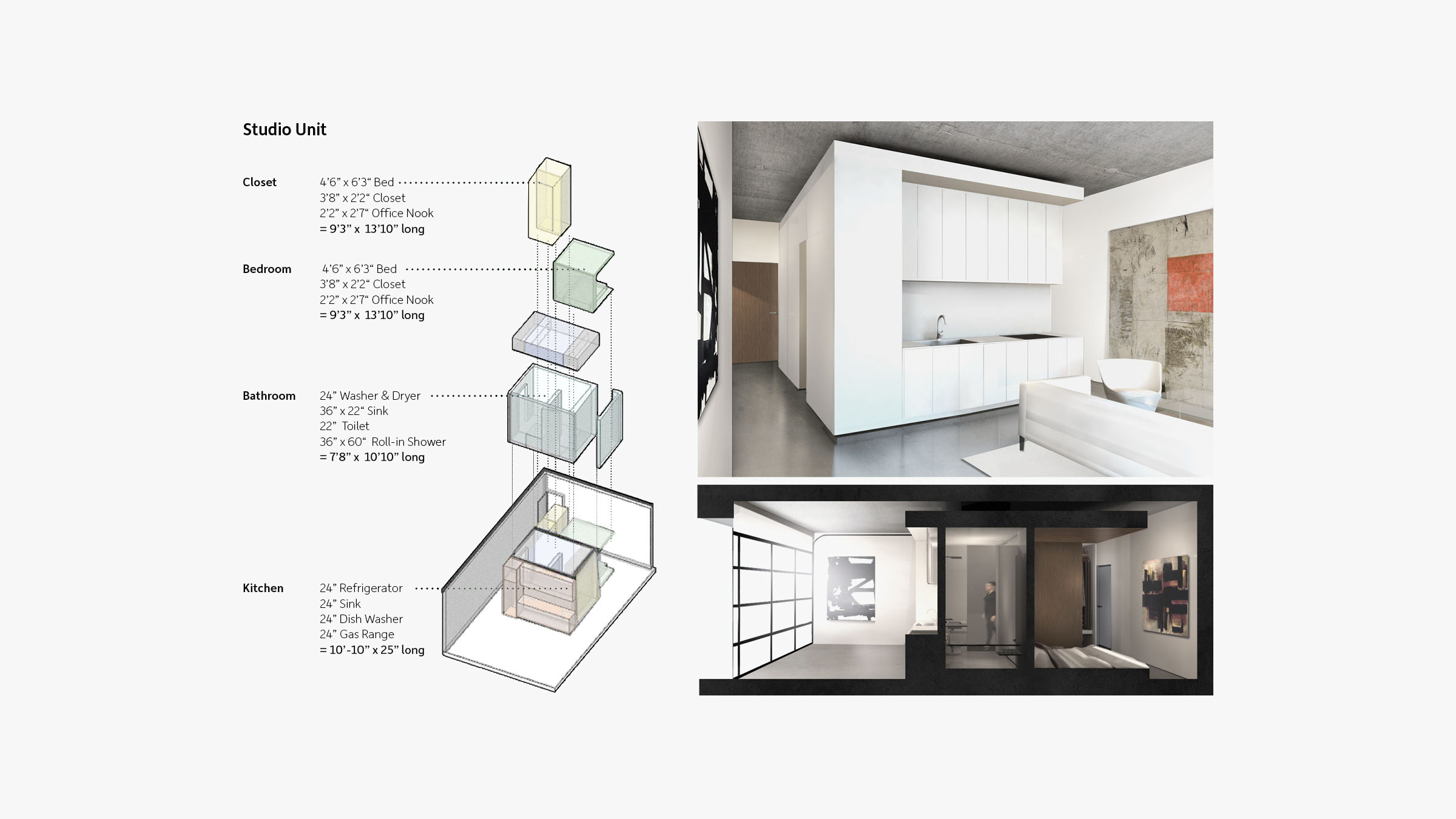 The building is a blank canvas in a constant state of change at the behest of its inhabitants; a flexible hub conducive to their interactive, collaborative, creative lifestyles. Inside, soaring ceilings, an efficient prefabricated pod concept, and communal amenity spaces—from workshops to photo and recording studios—are featured on each floor.