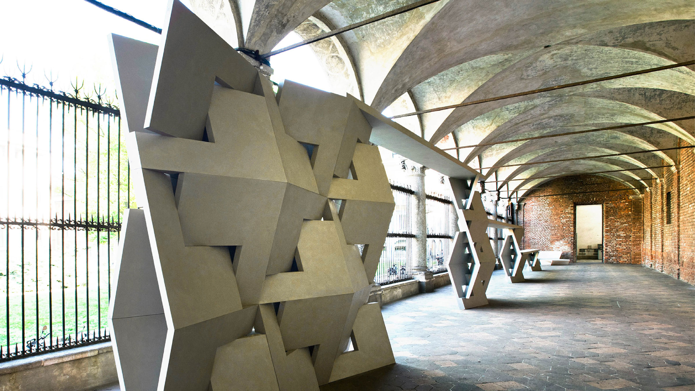 Moretti presented the QuaDror geometry with the manufacture and installation of a unique 20 meter wall at the Universita degli Studi di Milano for the Interni Mutant Architecture & Design event in April 2011.