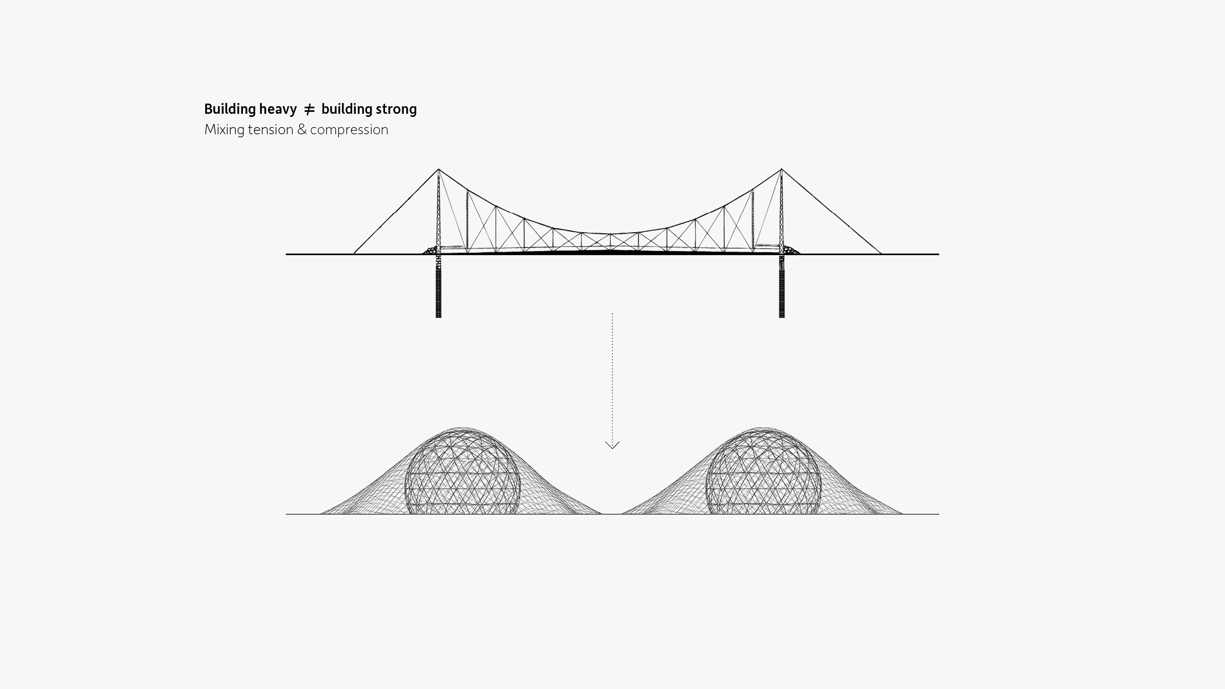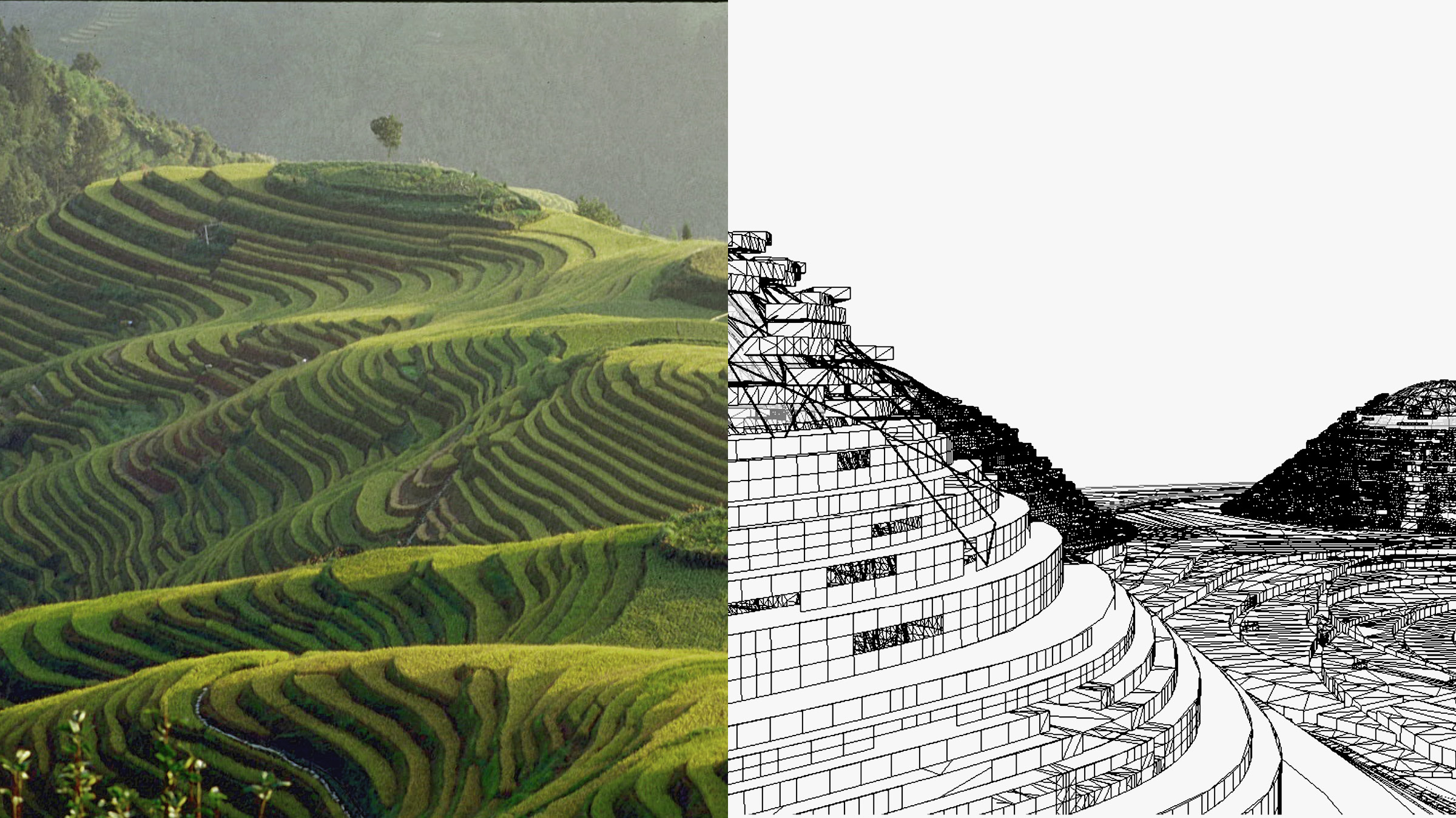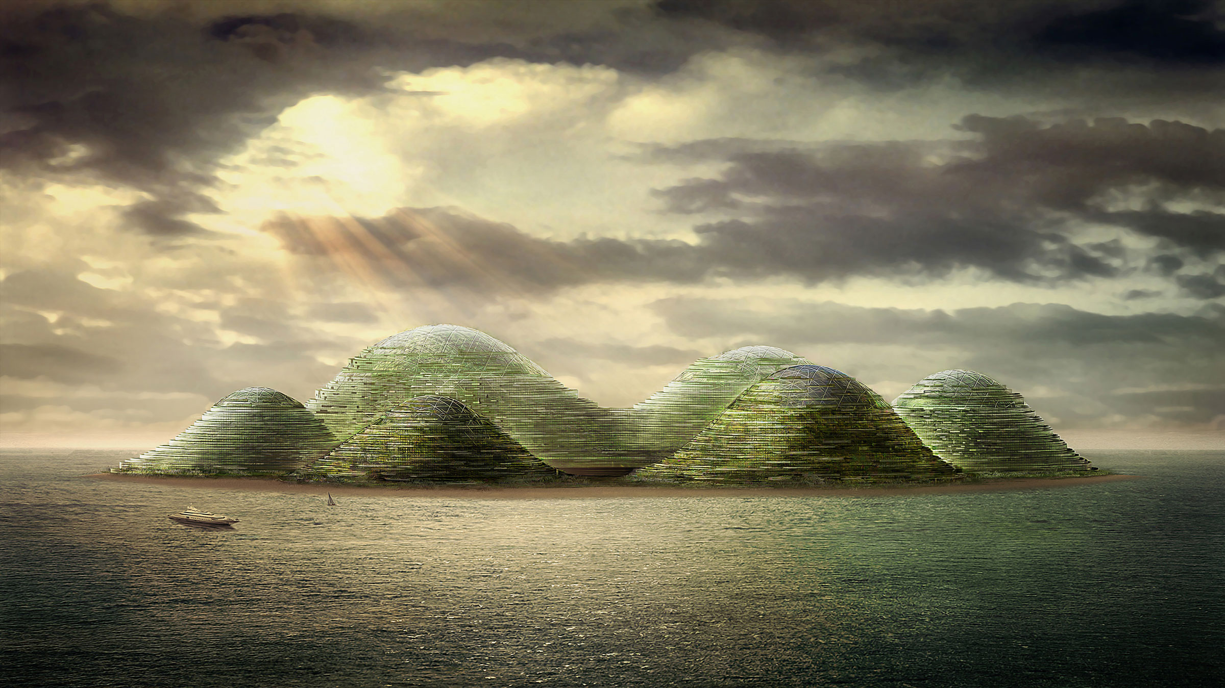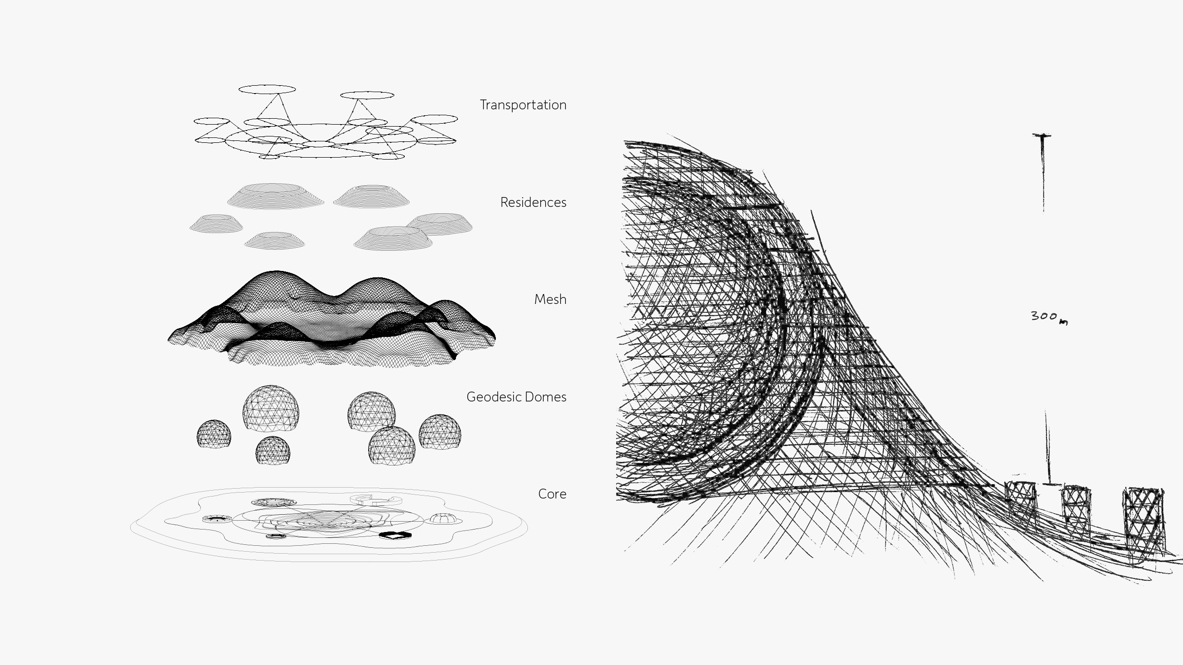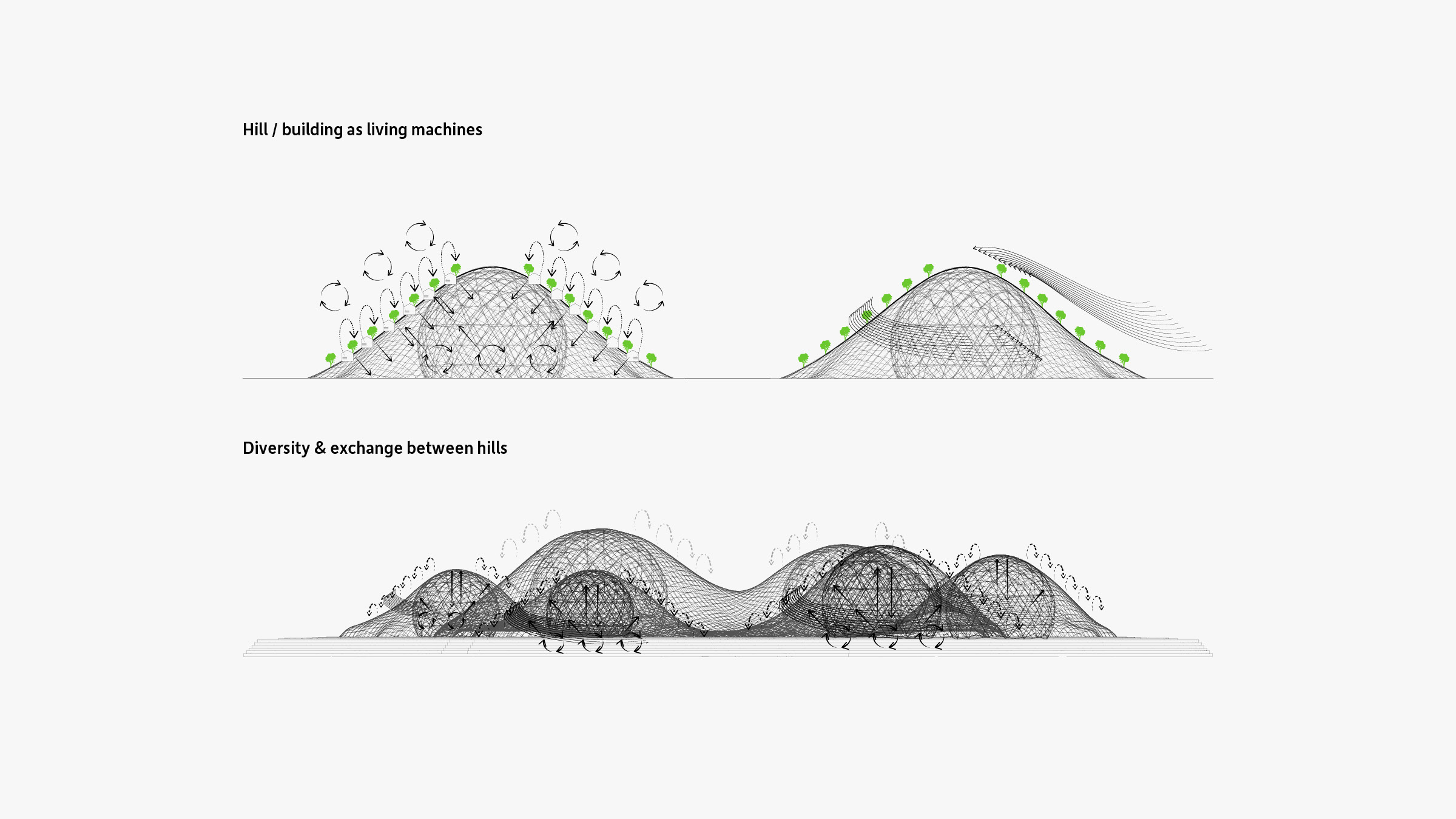 Drawing from Buckminster Fuller’s logic of a geodesic dome, each hill is formed by a structural sphere that houses green-roofed residences on the exterior and commercial companies on the interior. The sloped landscape allows for panoramic views of the horizon line, and acts as a ventilation system, where both wind and rain are recycled constantly. The green hills, as Fuller discovered, provide significant, natural means for heating and cooling, and contribute to an individual ecosystem and sustainable energy renewal operation.