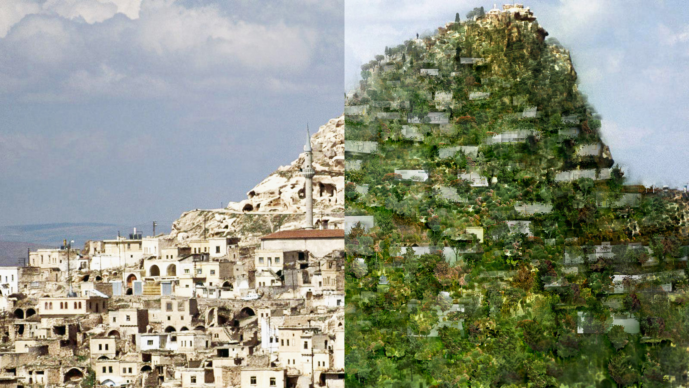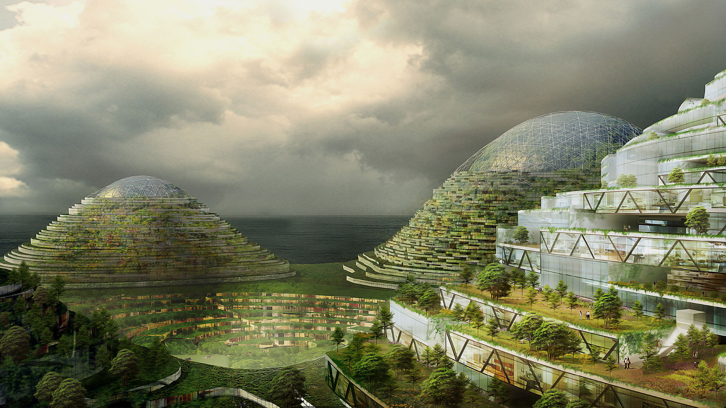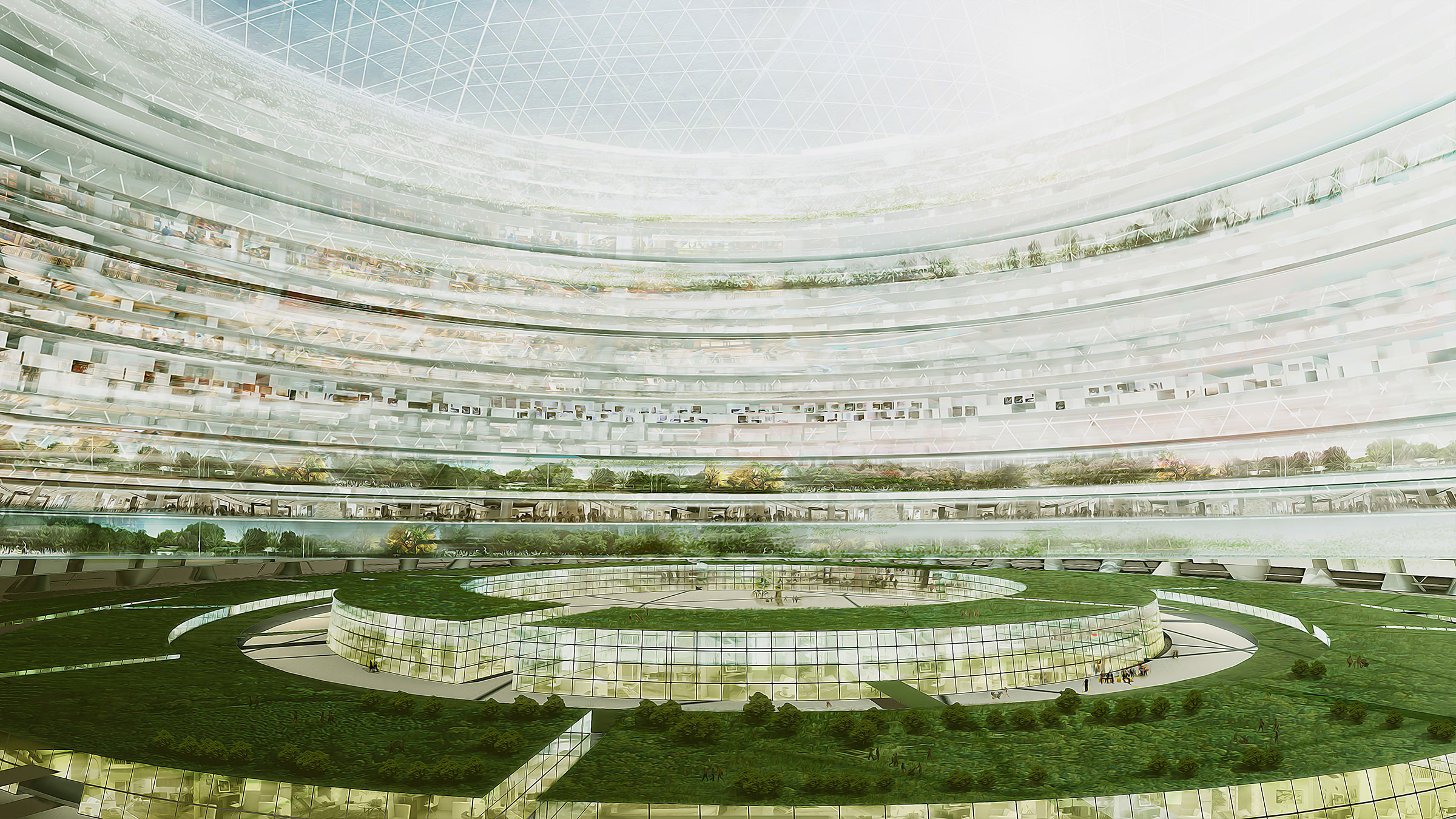 To address the problematic configuration of modern cities, where selfish, stick-like buildings absorb energy and emit waste, we envisioned a new organization of the urban grid. Independent vertical buildings on a 2D grid are rotated to form horizontal structures on a 3D grid, wrapping around each dome in concentric circles. This three-dimensional geographical topography allows for major benefits, including accessibility to the commercial centers of surrounding hillsides. To get from one point to another, residents can either walk around or go straight across at every level.