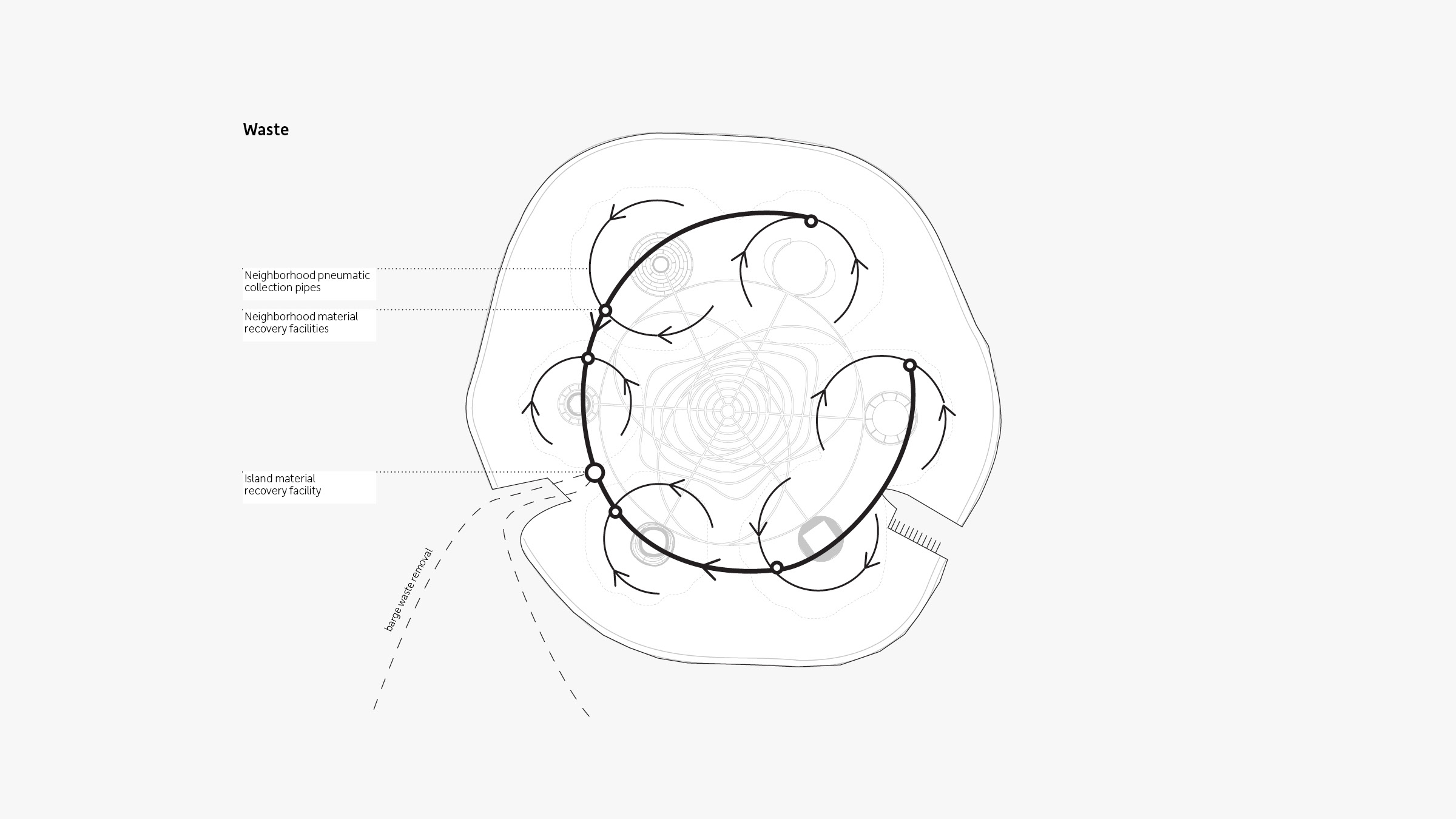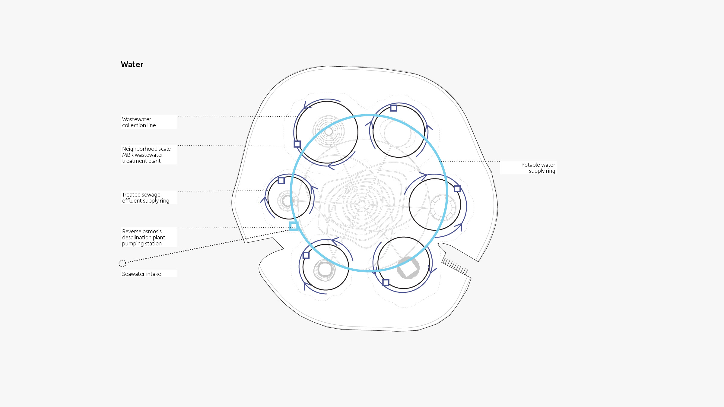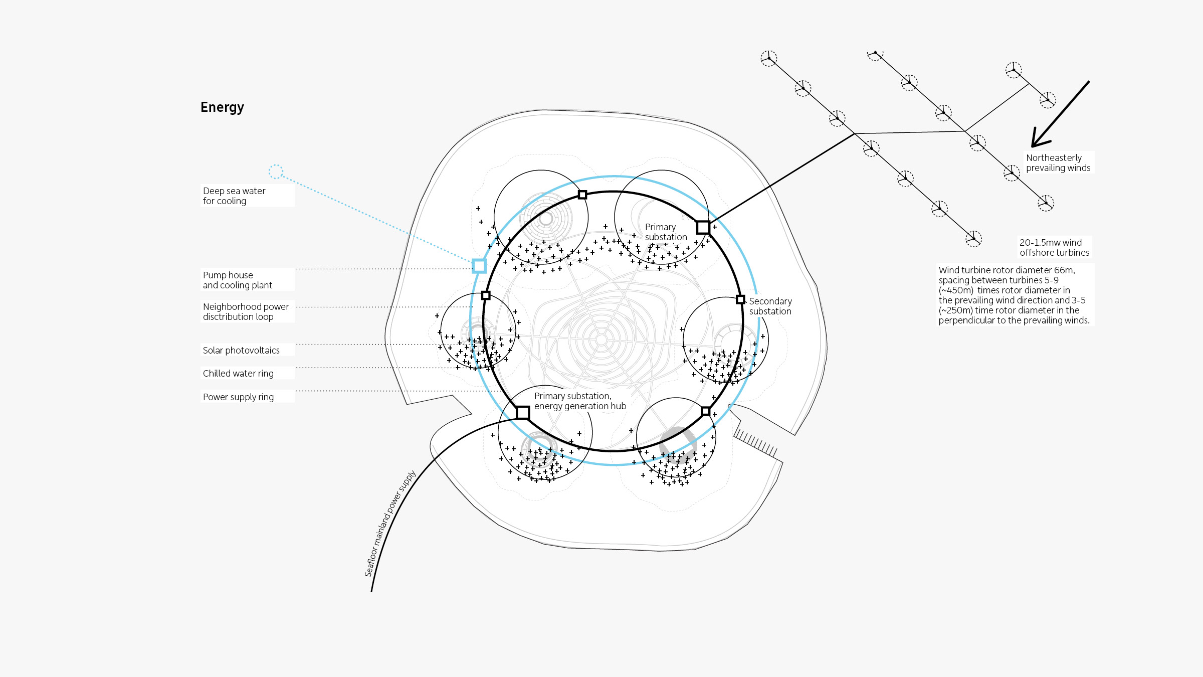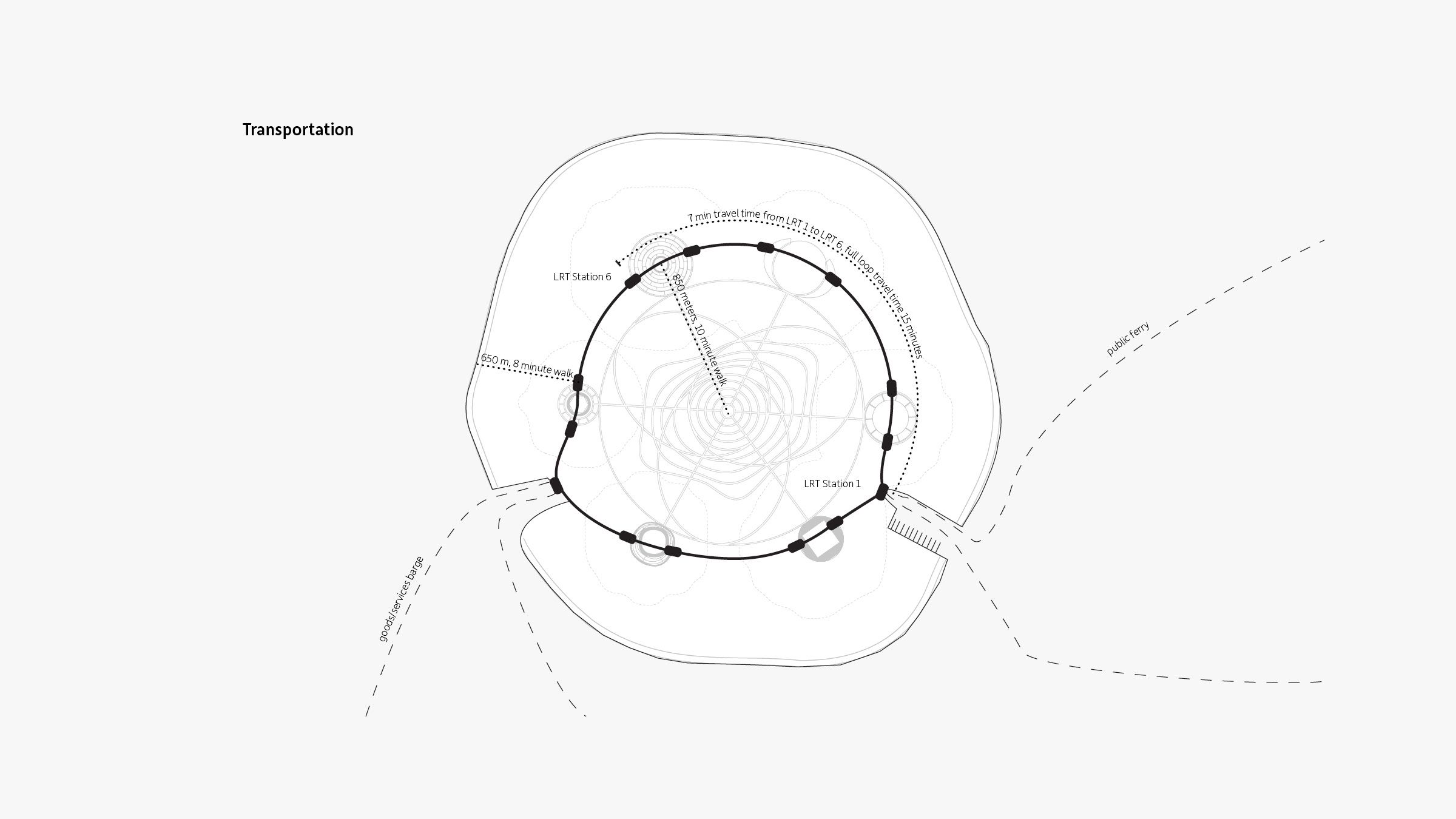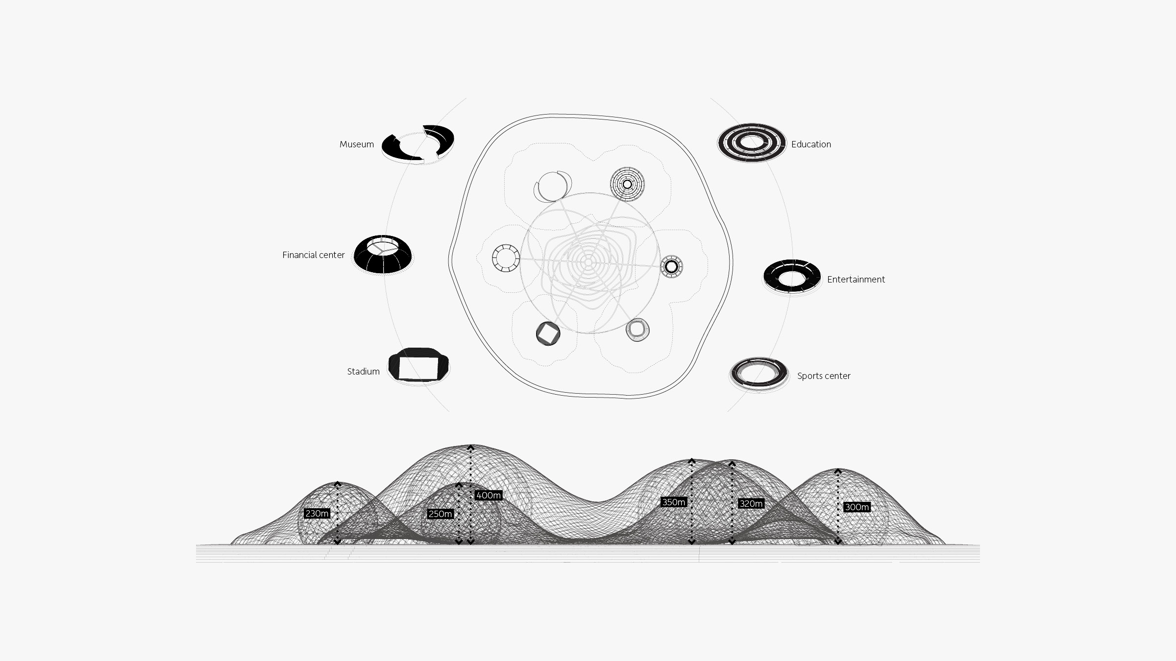 Informed by earlier concepts of ideal cities developed by thinkers Ebenezer Howard and Nathan Revercomb, our proposal for the island community HavvAda (meaning “air island” in Turkish) consists of six hills that encircle a downtown center. This orientation—rooted in the sacred geometry of the number seven, where six objects surround a seventh—is apparent in nature, religion, physics, and even in the molecular shape of water.
